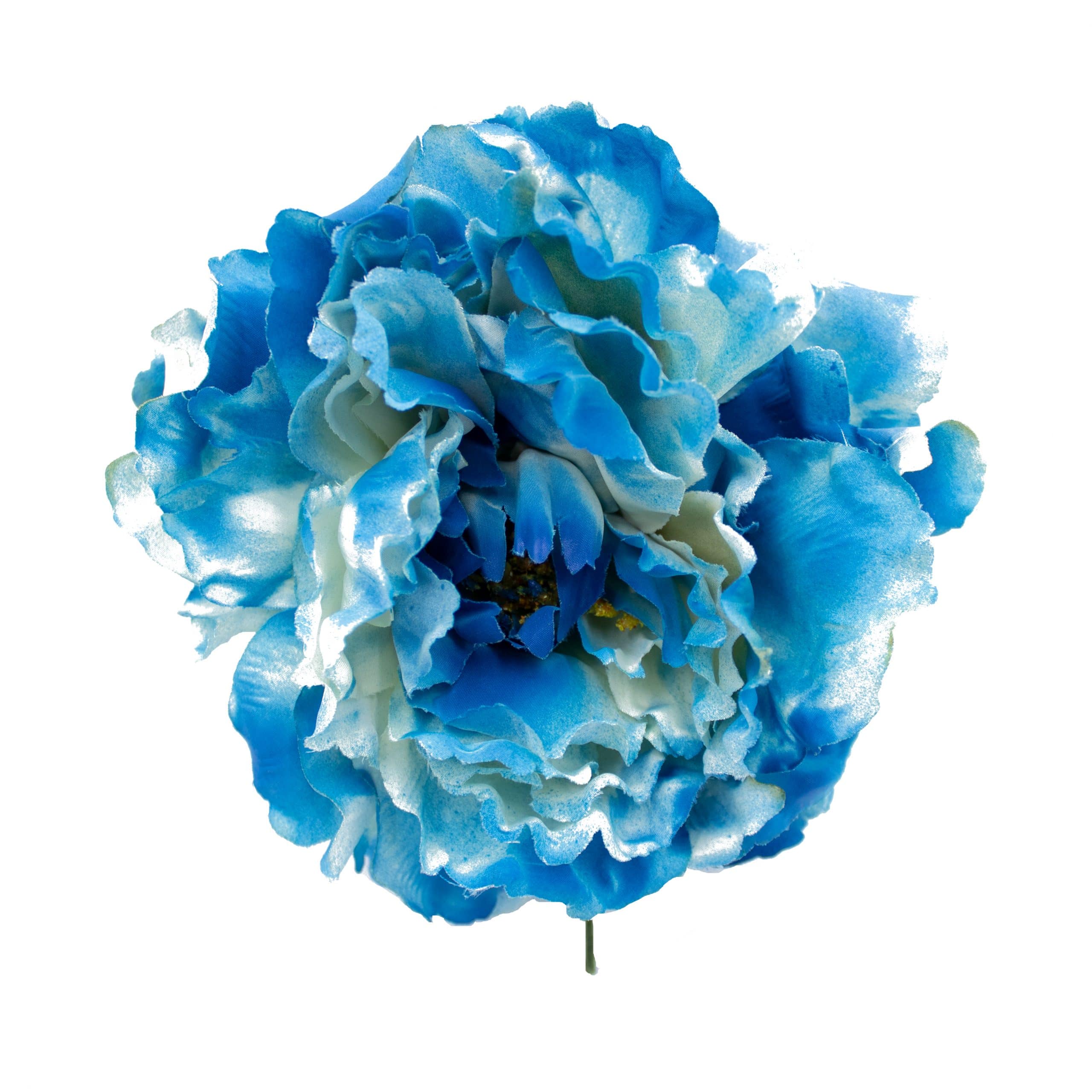Flor de flamenca estilo peonia, de tamaño grande, con un diámetro aproximado de 16,5 cms y color azul marino. Elaborada artesanalmente en Sevilla.