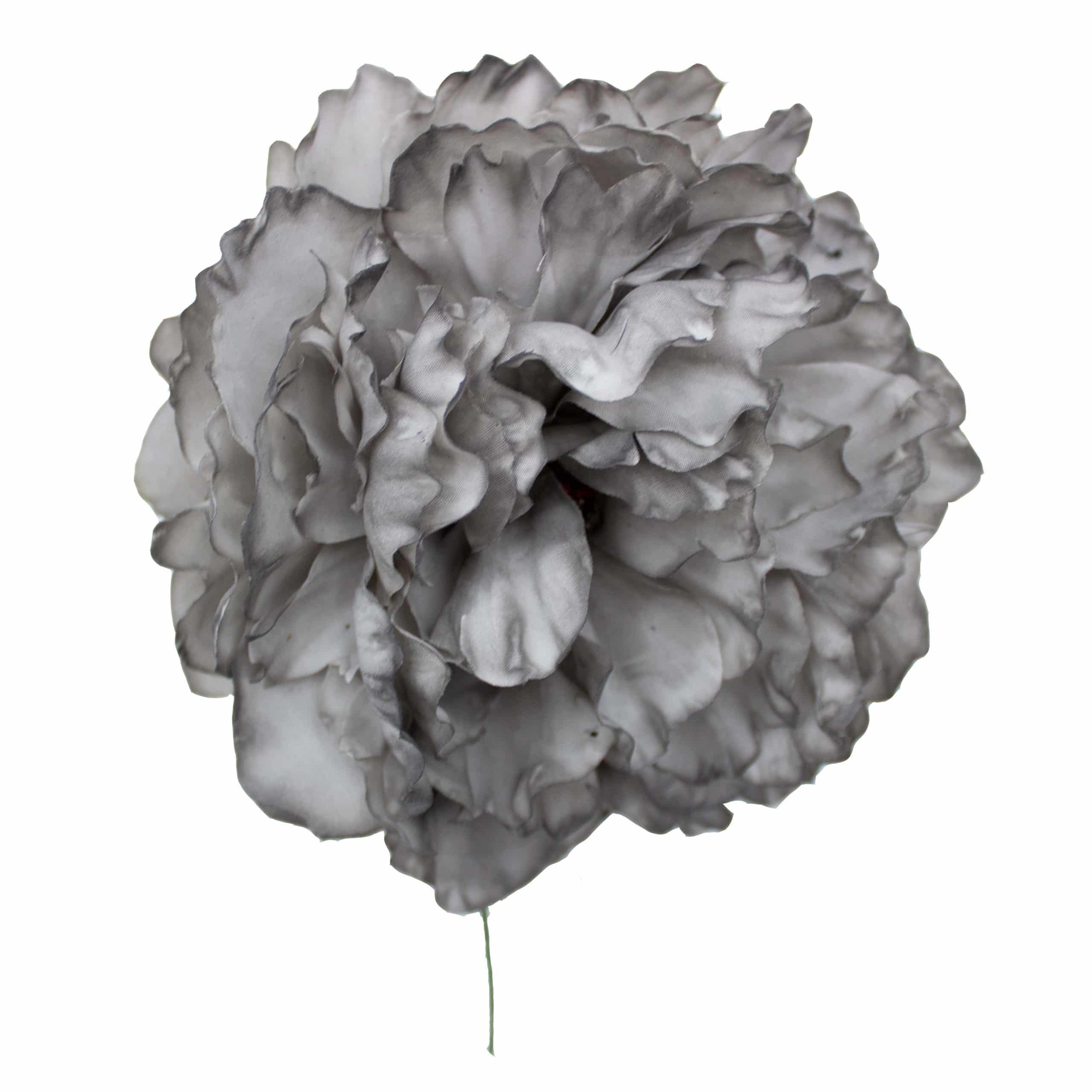 Flor de flamenca estilo peonia, de tamaño grande, con un diámetro aproximado de 14,5 cms y color Gris. Elaborada artesanalmente en Sevilla.