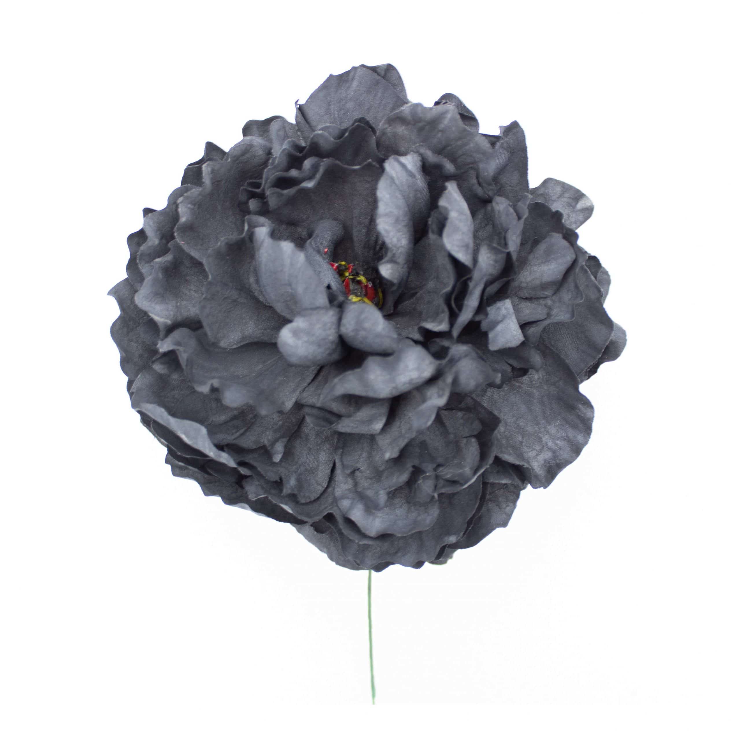 Flor de flamenca estilo peonia, de tamaño grande, con un diámetro aproximado de 14,5 cms y color Negro. Elaborada artesanalmente en Sevilla.