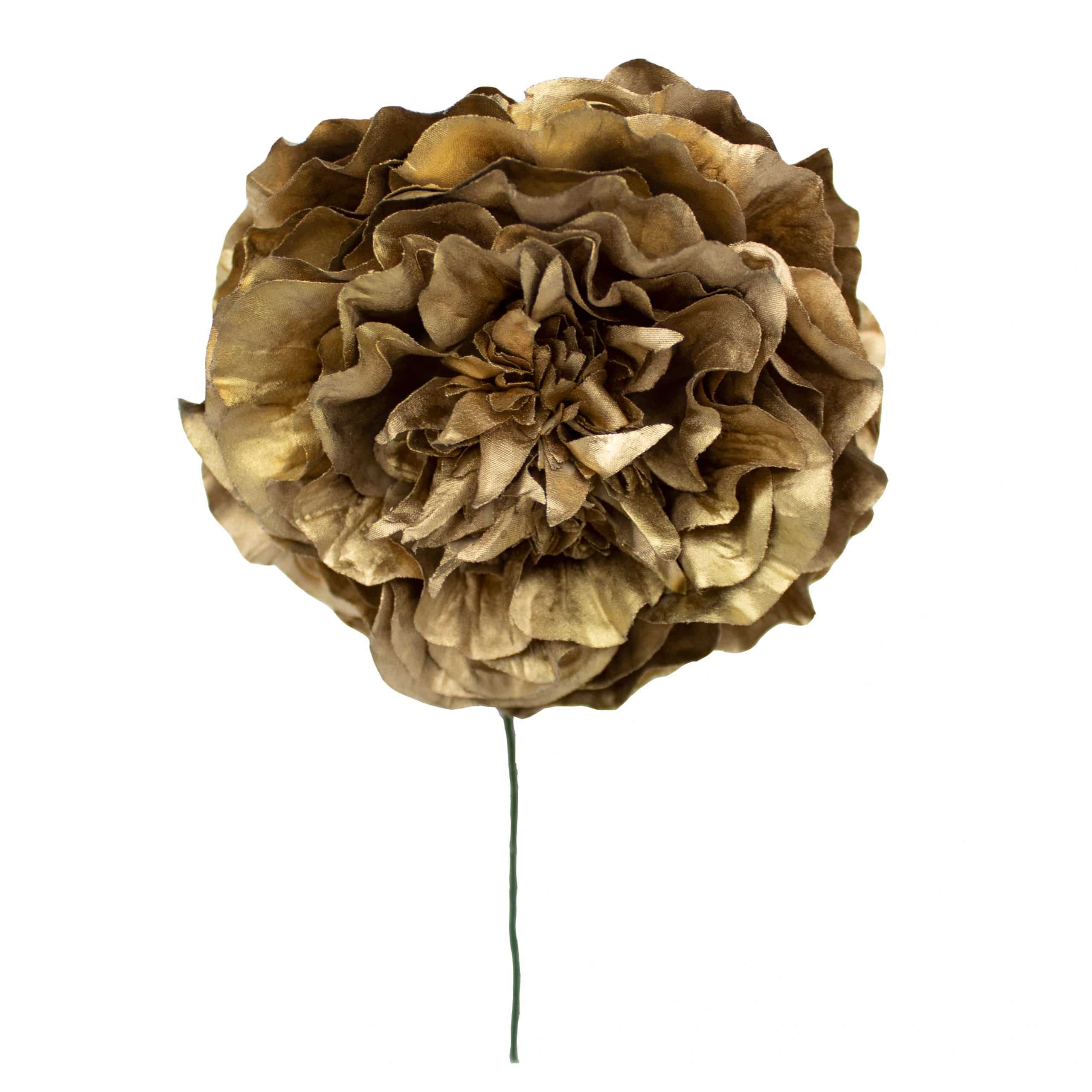 Flor de flamenca de tamaño mediano, con un diámetro aproximado de 9 cms y color Oro. Ideal para niñas o para crear tu propia combinación en ramillete. Elaborada artesanalmente en Sevilla.