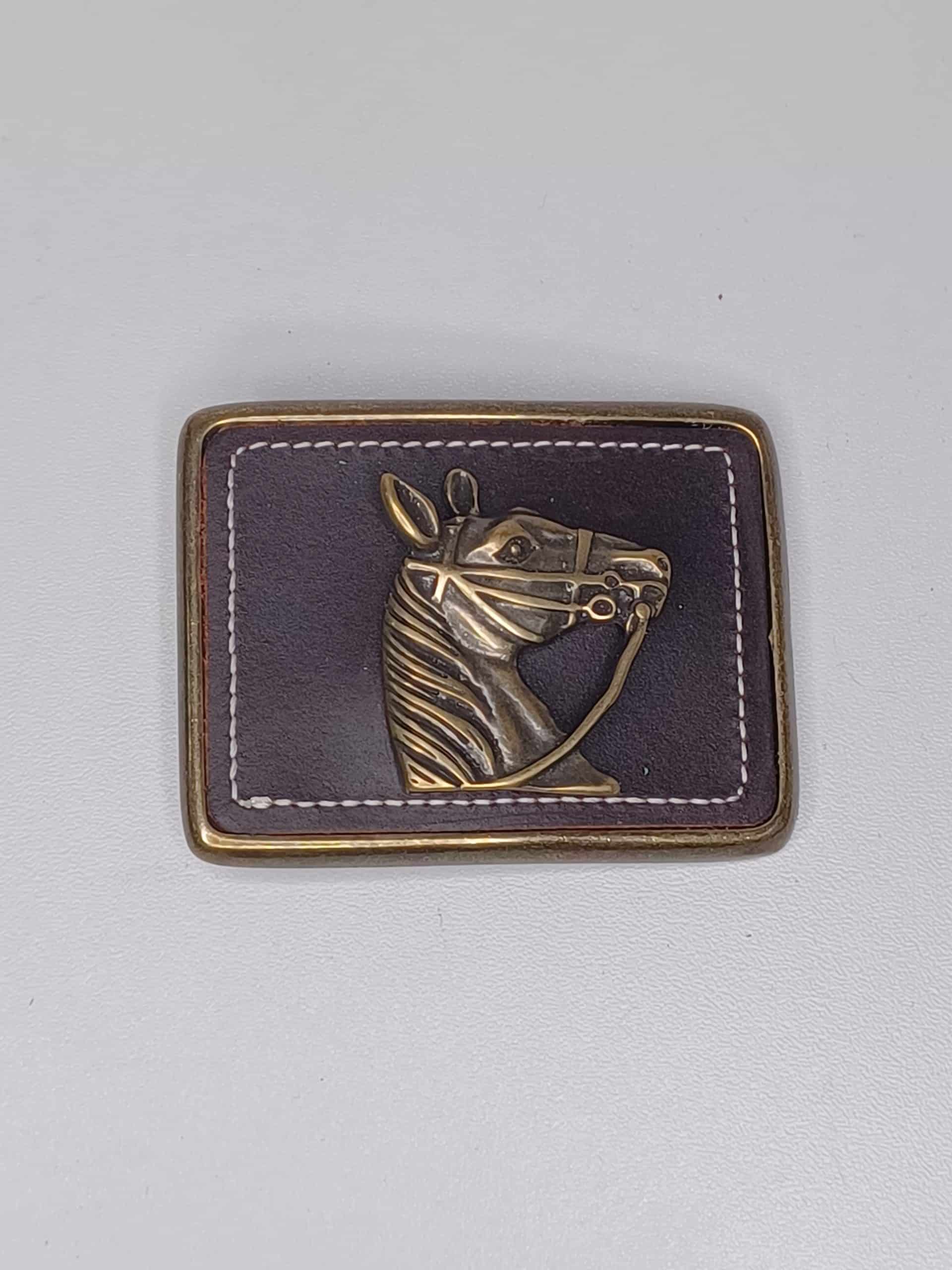 Hebilla de cuero color engrasado con caballo incrustado en color oro viejo. Ideal para combinar con nuestros cinturones.
