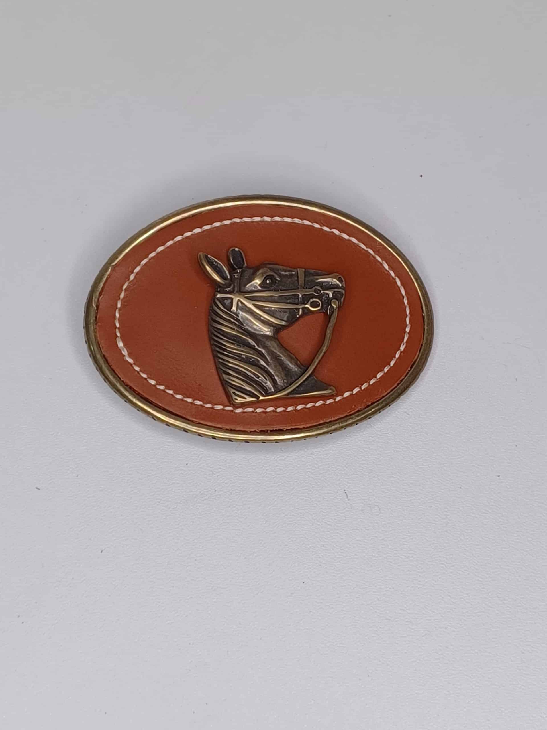 Hebilla de cuero con caballo incrustado en color oro viejo. Ideal para combinar con nuestros cinturones.