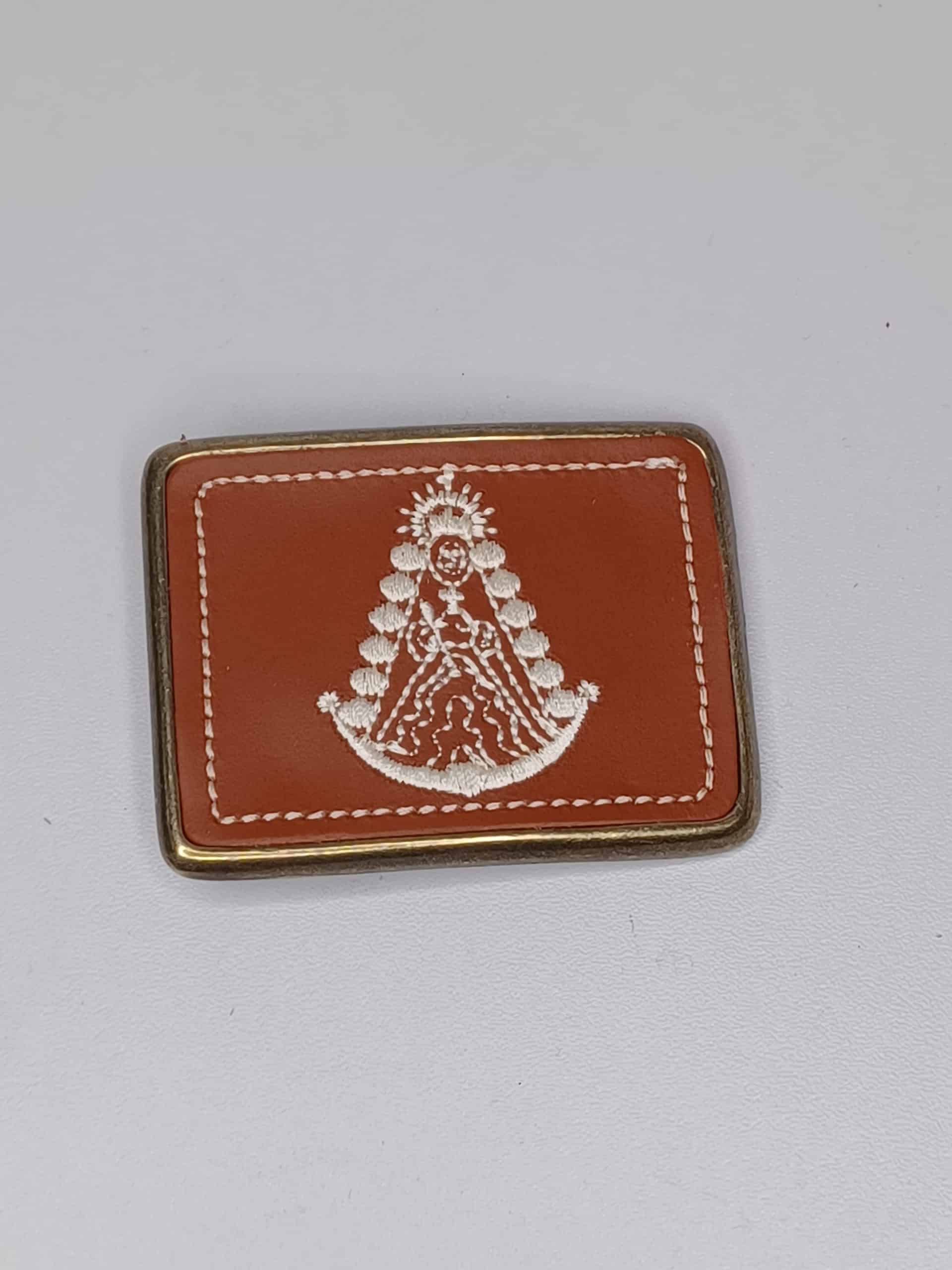 Hebilla de cuero cuadrada con Virgen del Rocío bordada