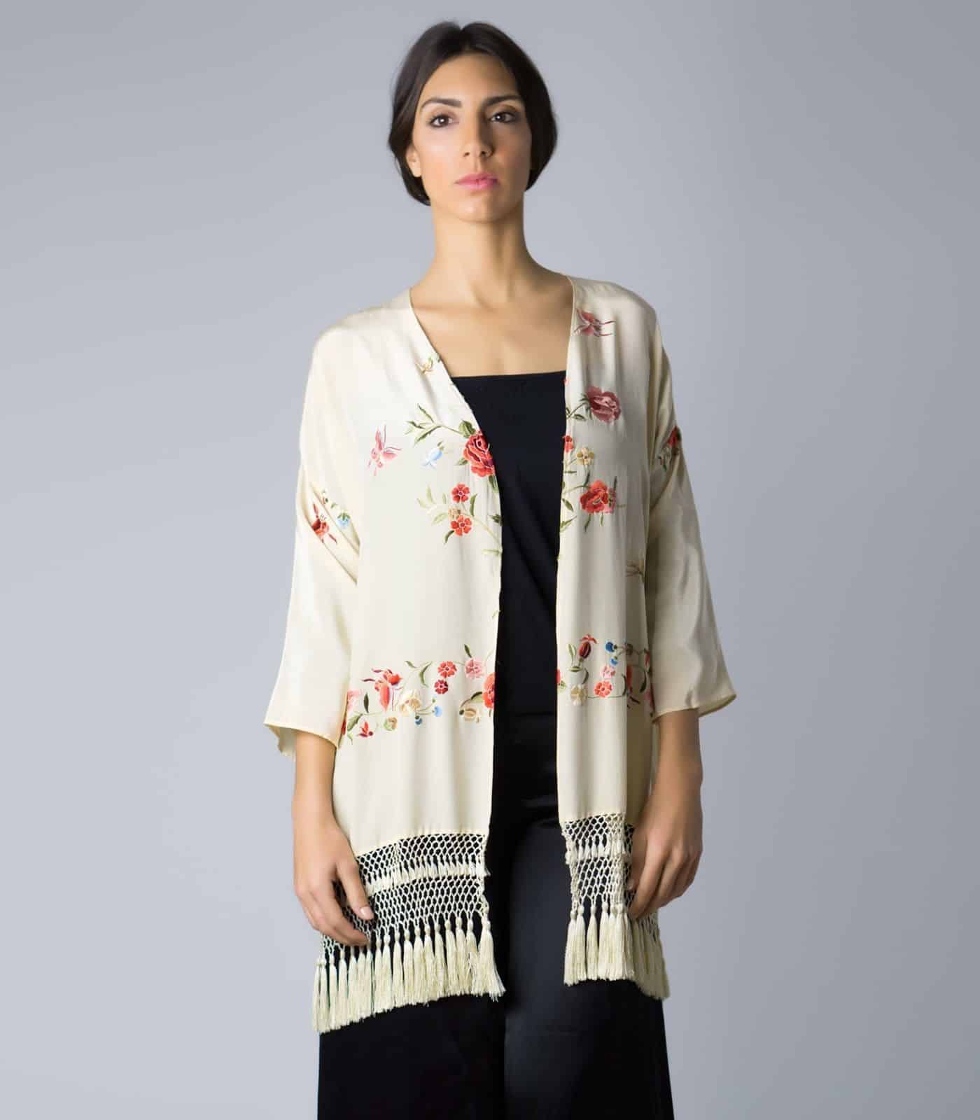 Elegante kimono con mangas en tono blanco adornado de flores en distintas tonalidades. Adornan al kimono flecos de seda natural. Muy elegante para combinar con cualquier look.