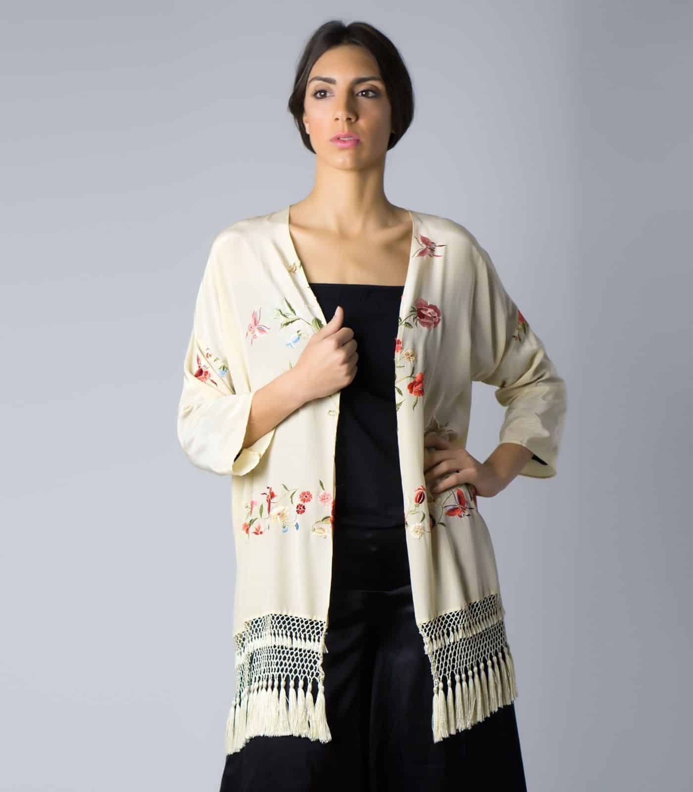 Kimono confeccionado a partir de mantones bordados a mano. Los flecos son de seda natural.