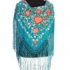 Mantón aguamarina bordado en amarillo, enrejado y flecado a mano con seda natural. Medidas 135x60cm aprox. (Sólo el mantón) más los flecos 25 cm (incluyendo el enrejado). Fabricado artesanalmente en la provincia de Sevilla.
