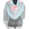 Mantón aguamarina bordado en multicolor, enrejado y flecado a mano con seda natural. Medidas 135x60cm aprox. (Sólo el mantón) más los flecos 25 cm (incluyendo el enrejado). Fabricado artesanalmente en la provincia de Sevilla.