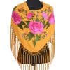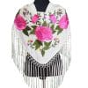 Mantón aguamarina bordado en multicolor, enrejado y flecado a mano con seda natural. Medidas 135x60cm aprox. (Sólo el mantón) más los flecos 25 cm (incluyendo el enrejado). Fabricado artesanalmente en la provincia de Sevilla.