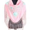 Mantón aguamarina bordado en tonos rojos y verdes, enrejado y flecado a mano con seda natural. Medidas 135x60cm aprox. (Sólo el mantón) más los flecos 25 cm (incluyendo el enrejado). Fabricado artesanalmente en la provincia de Sevilla.