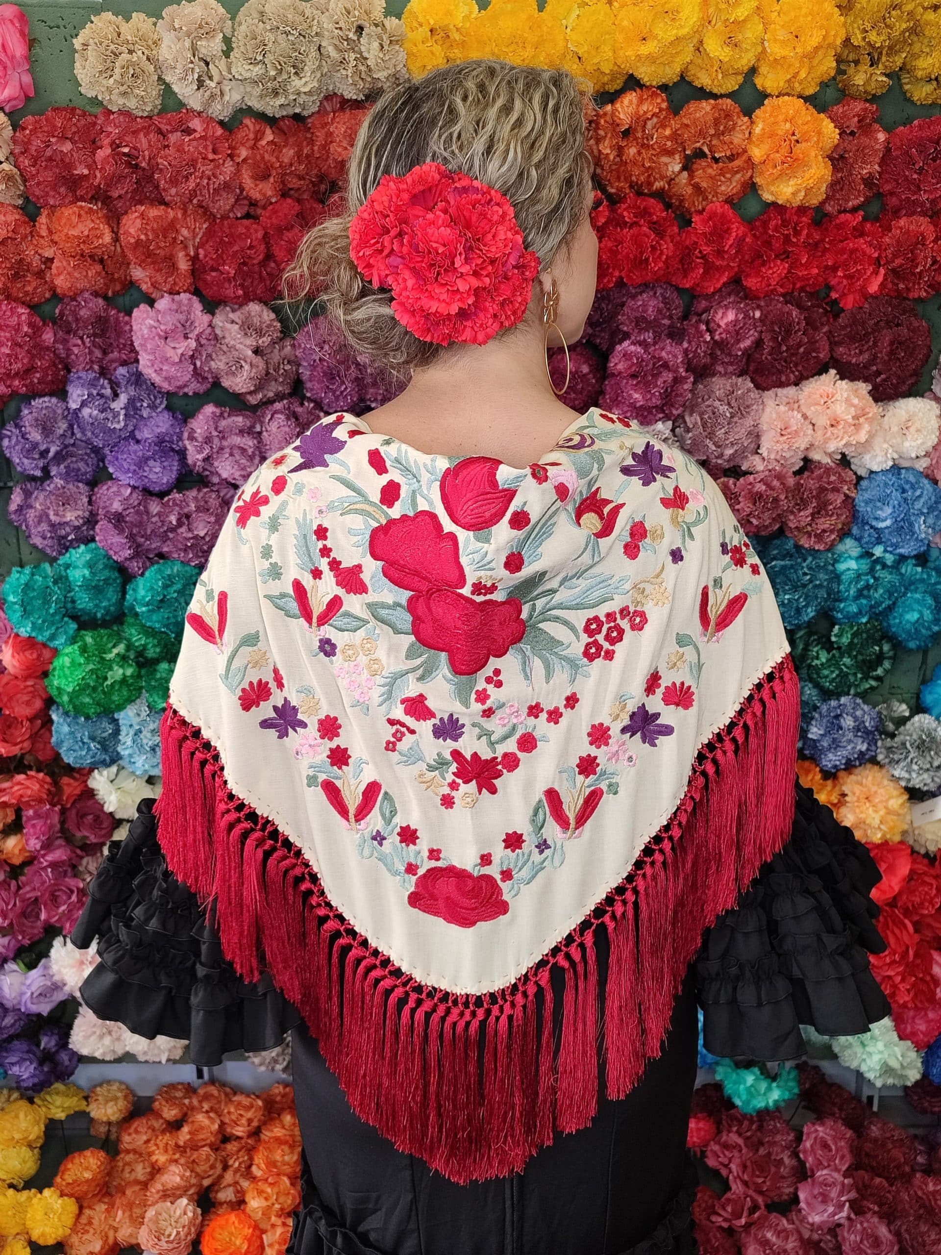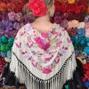 Mantón color beige bordado en multicolor de algodón flecado en mano con borlón en seda y enrejado en seda natural. Medidas 135x60cm aprox. (Sólo el mantón) más los flecos 25 cm (incluyendo el enrejado). Fabricado artesanalmente en la provincia de Sevilla.