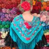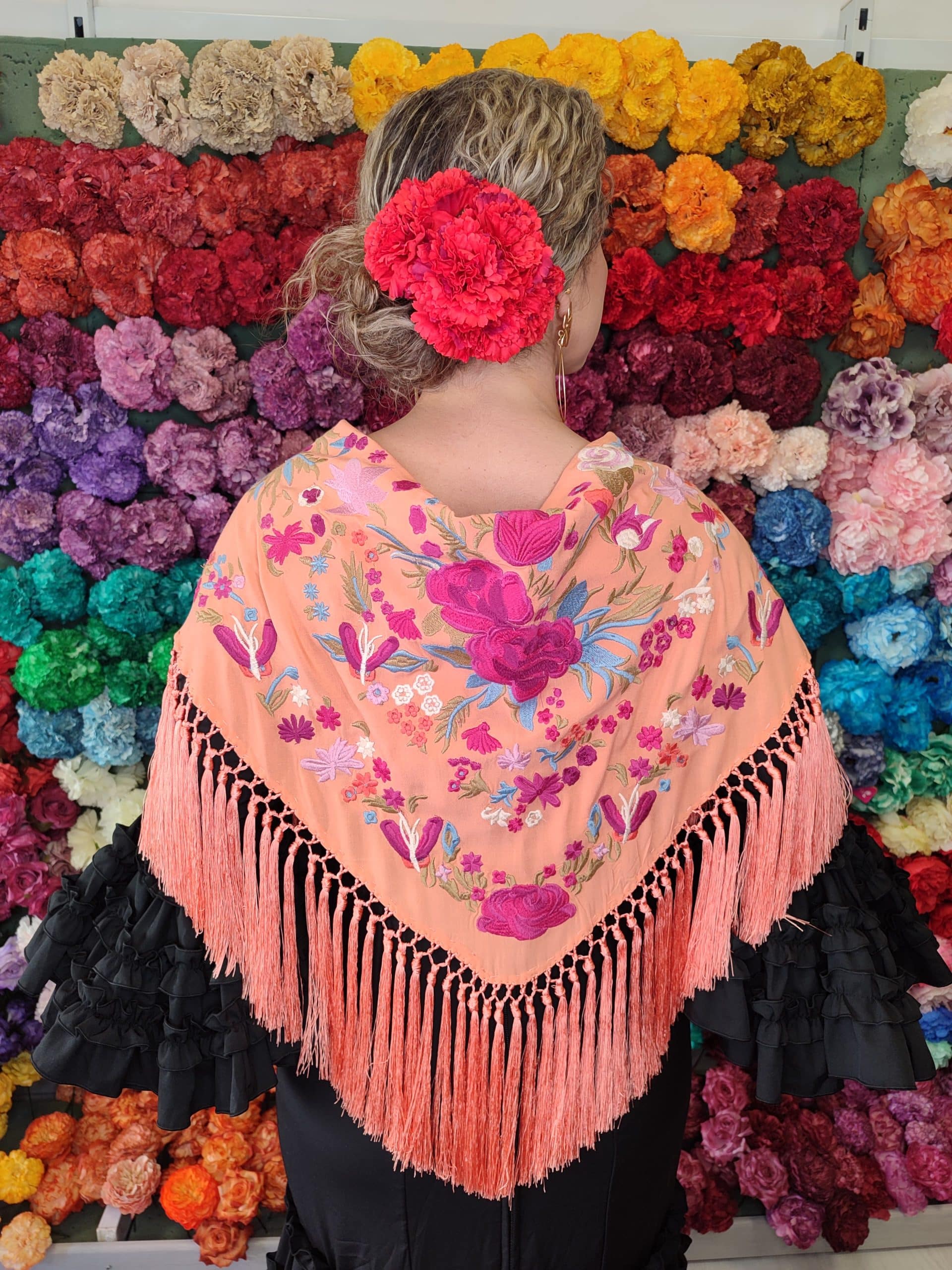Mantón color mandarina bordado en tonos buganvillas de algodón flecado en mano con borlón en seda y enrejado en seda natural. Medidas 135x60cm aprox. (Sólo el mantón) más los flecos 25 cm (incluyendo el enrejado). Fabricado artesanalmente en la provincia de Sevilla.