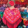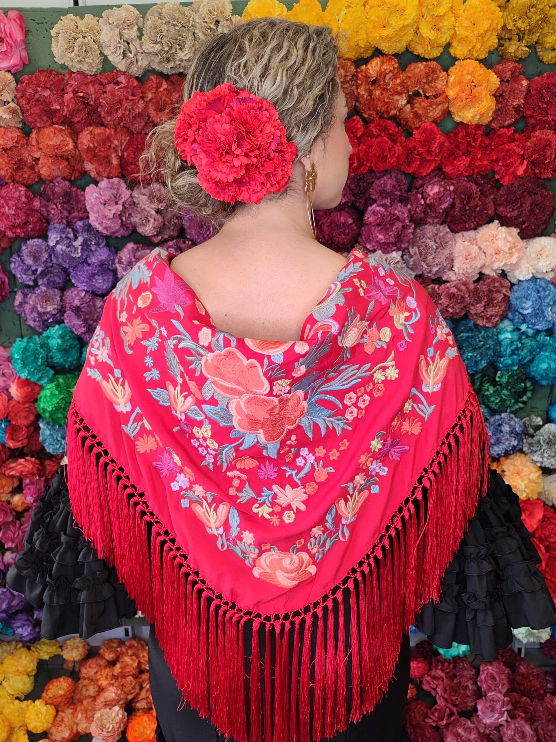 Mantón color rojo bordado en multicolor de algodón flecado en mano con borlón en seda y enrejado en seda natural. Medidas 135x60cm aprox. (Sólo el mantón) más los flecos 25 cm (incluyendo el enrejado). Fabricado artesanalmente en la provincia de Sevilla.