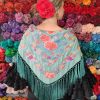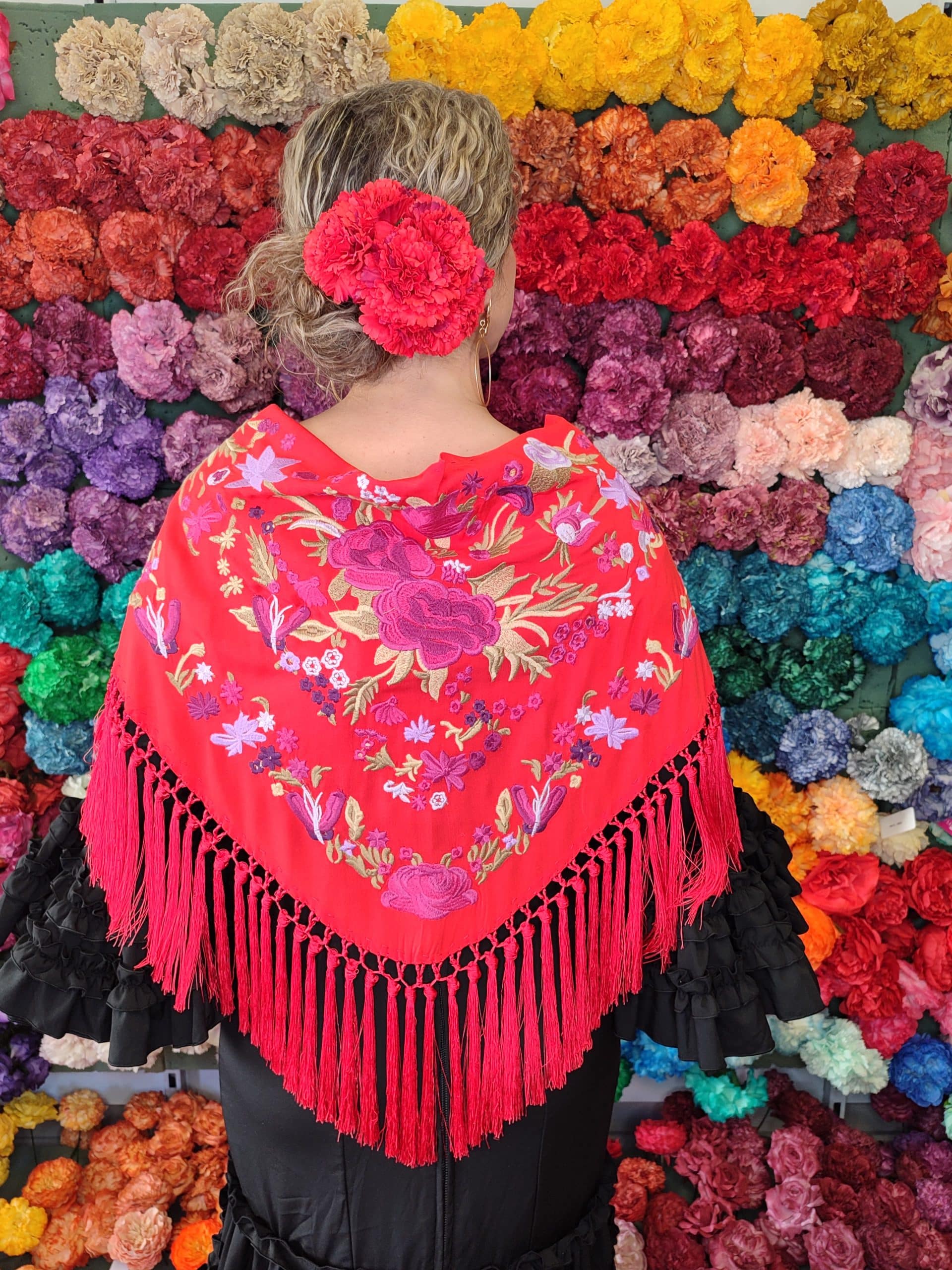 Mantón color rojo bordado en multicolor de algodón flecado en mano con borlón en seda y enrejado en seda natural. Medidas 135x60cm aprox. (Sólo el mantón) más los flecos 25 cm (incluyendo el enrejado). Fabricado artesanalmente en la provincia de Sevilla.