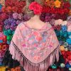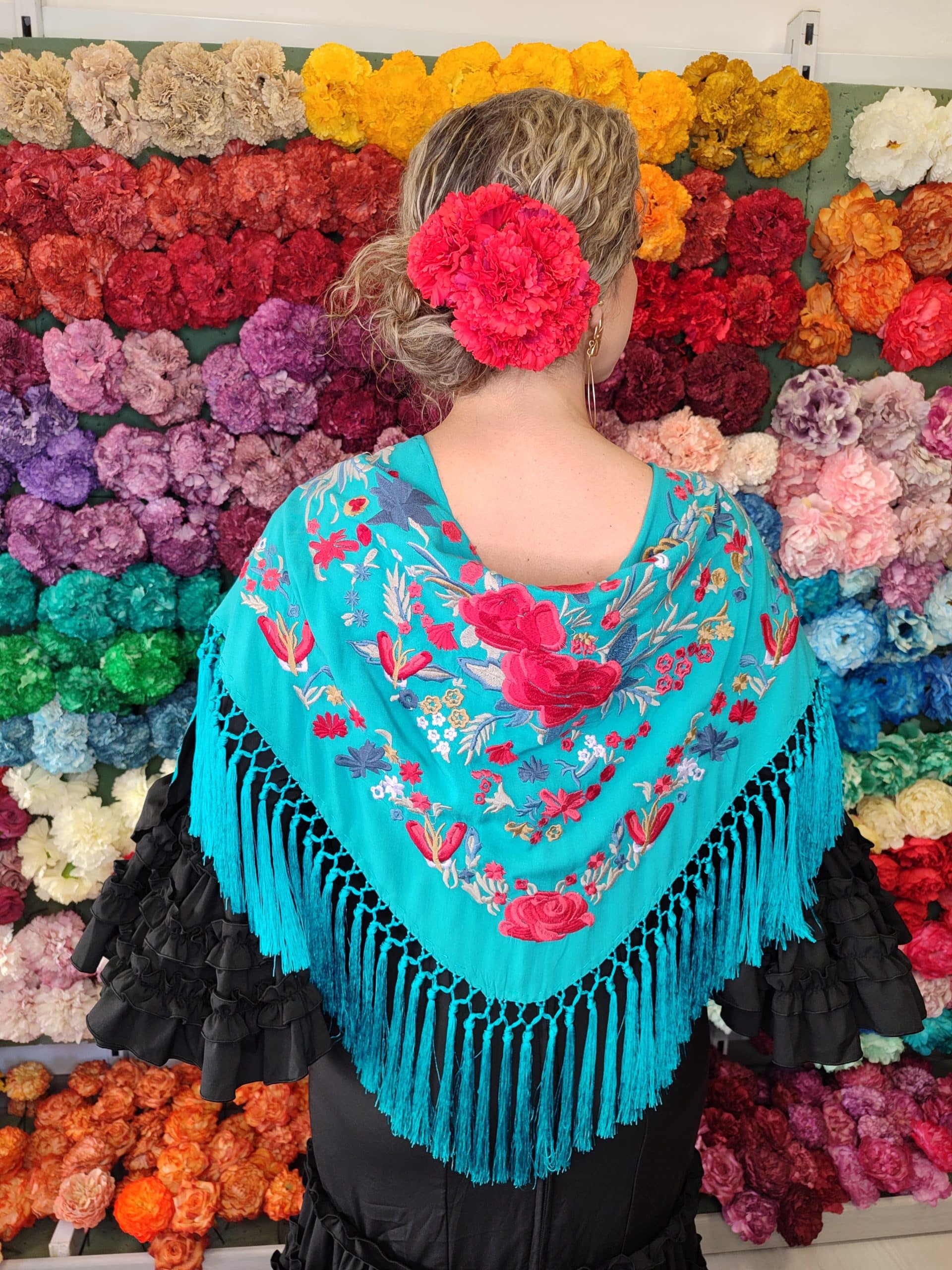Mantón color turquesa bordado en multicolor de algodón flecado en mano con borlón en seda y enrejado en seda natural. Medidas 135x60cm aprox. (Sólo el mantón) más los flecos 25 cm (incluyendo el enrejado). Fabricado artesanalmente en la provincia de Sevilla.