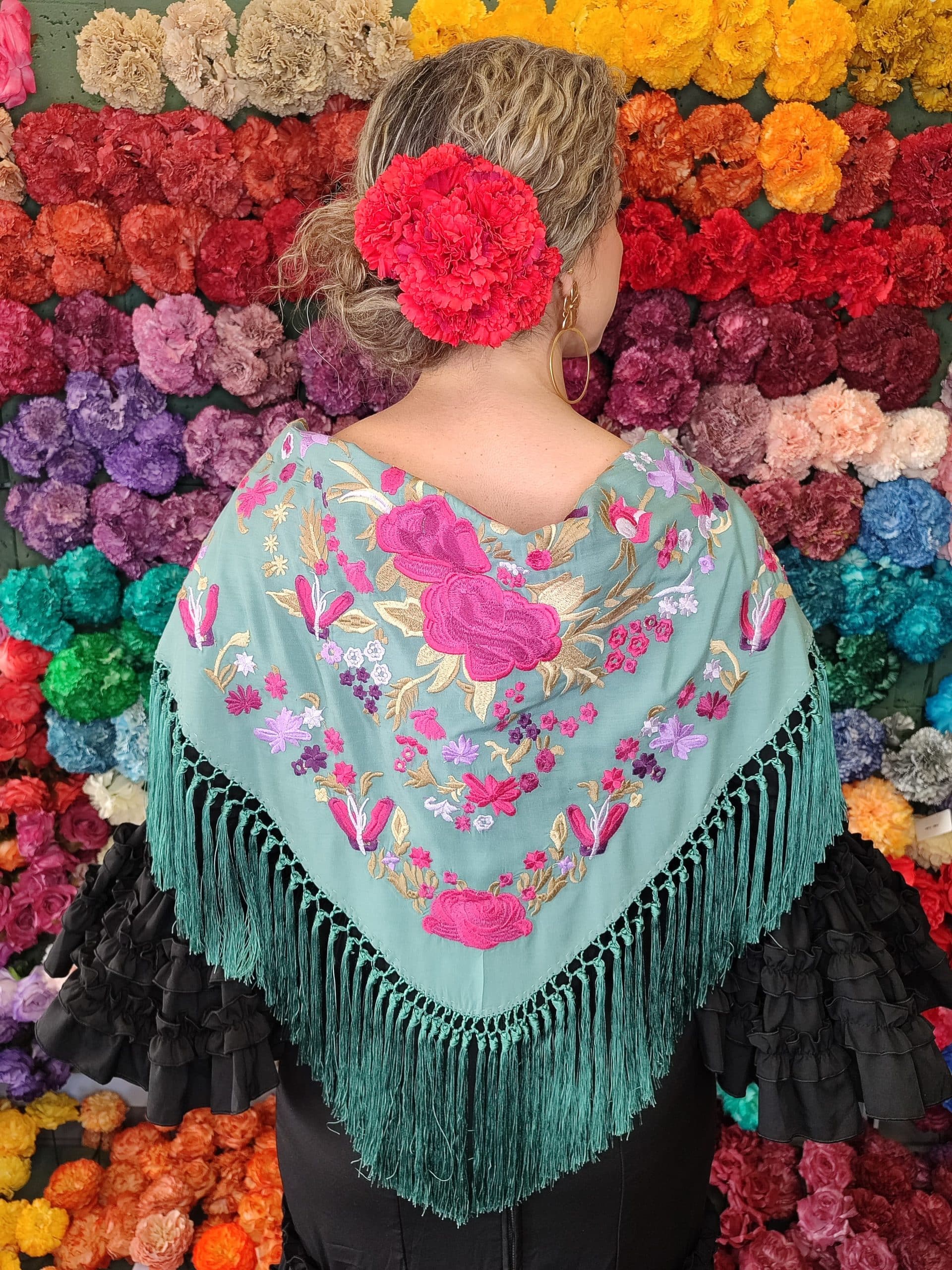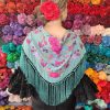 Mantón color verde jabonoso bordado en multicolor de algodón flecado en mano con borlón en seda y enrejado en seda natural. Medidas 135x60cm aprox. (Sólo el mantón) más los flecos 25 cm (incluyendo el enrejado). Fabricado artesanalmente en la provincia de Sevilla.