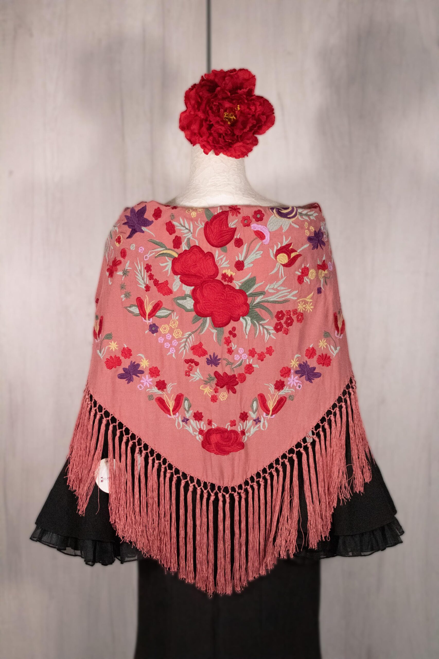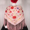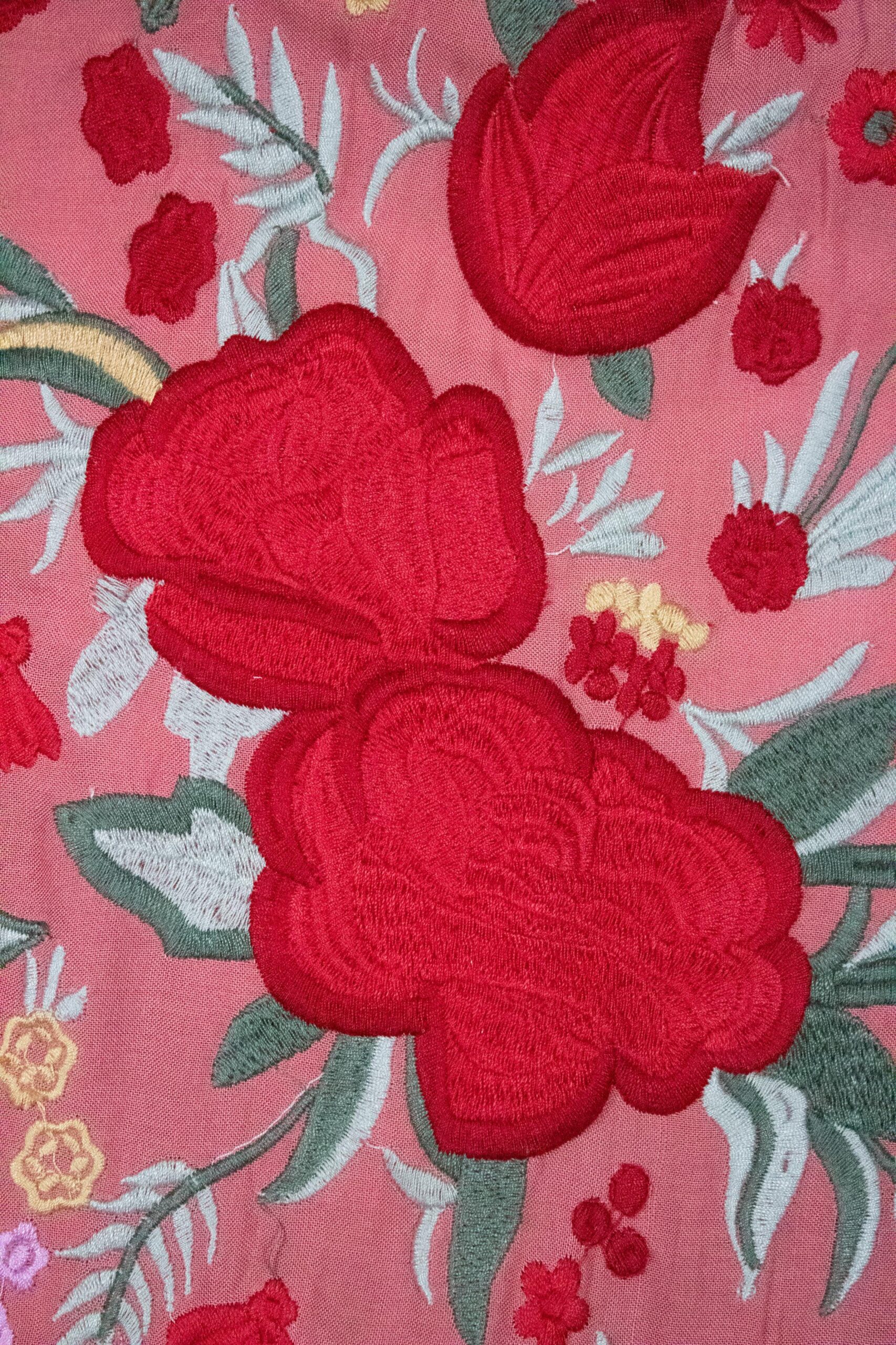 Mantón Alegría en color maquillaje oscuro, de algodón con bordado multicolor en hilo mate de seda.