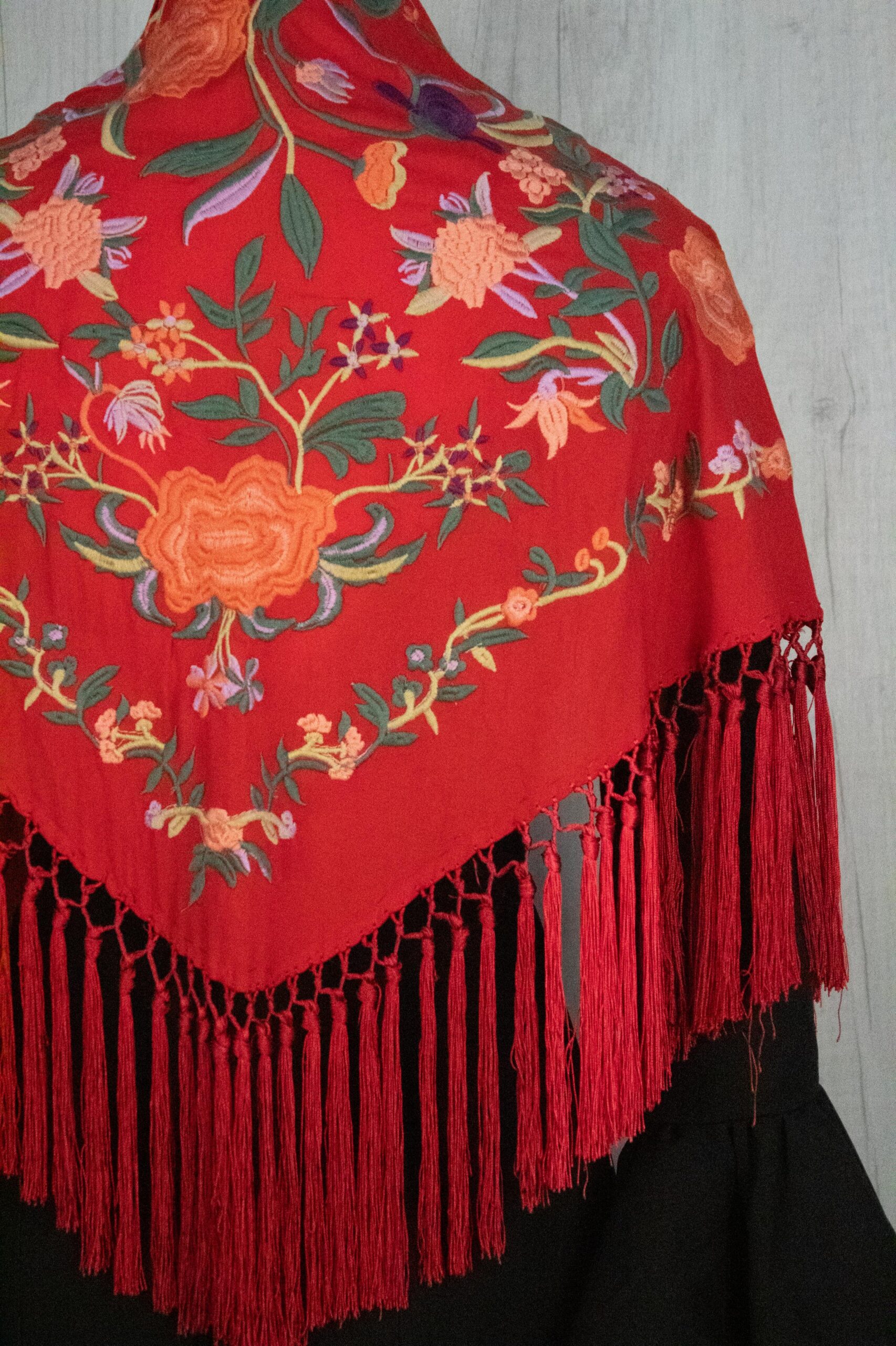 Mantón Alegría en color rojo, de algodón con bordado multicolor en hilo mate de seda.