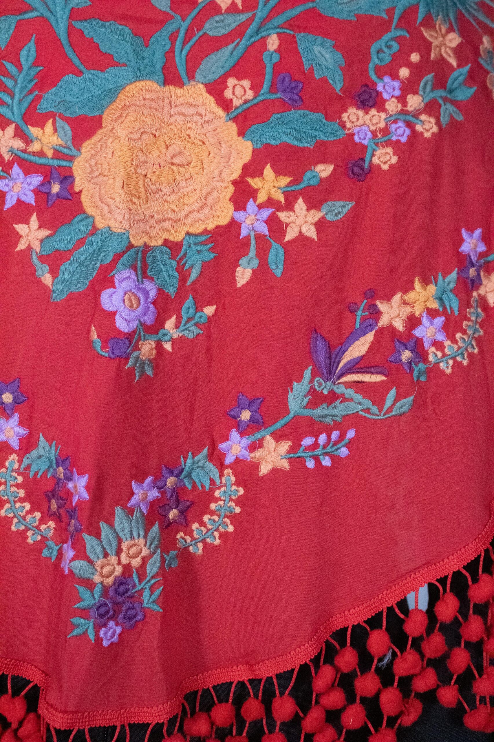 Mantón Alegría en color rojo, de algodón con bordado multicolor en hilo mate de seda.