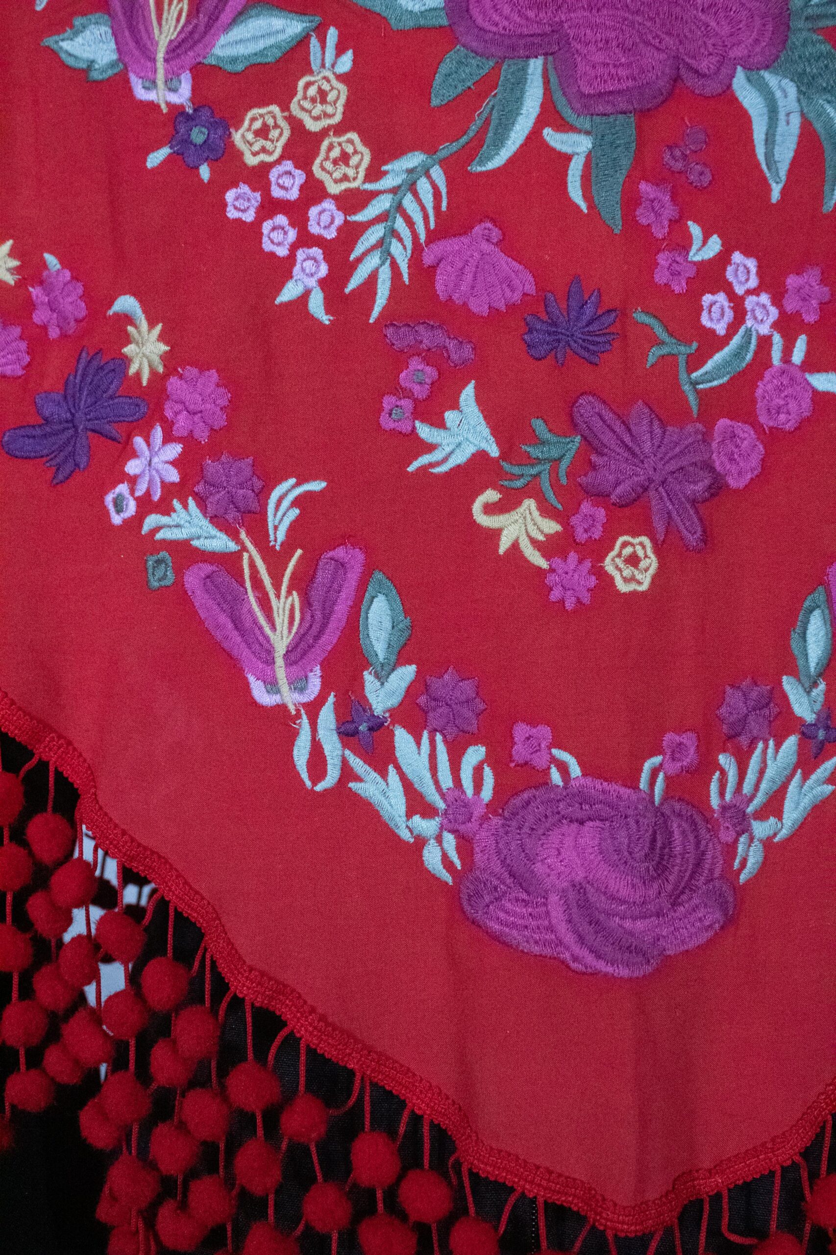 Mantón Alegría en color rojo, de algodón con bordado multicolor en hilo mate de seda.