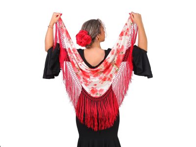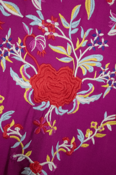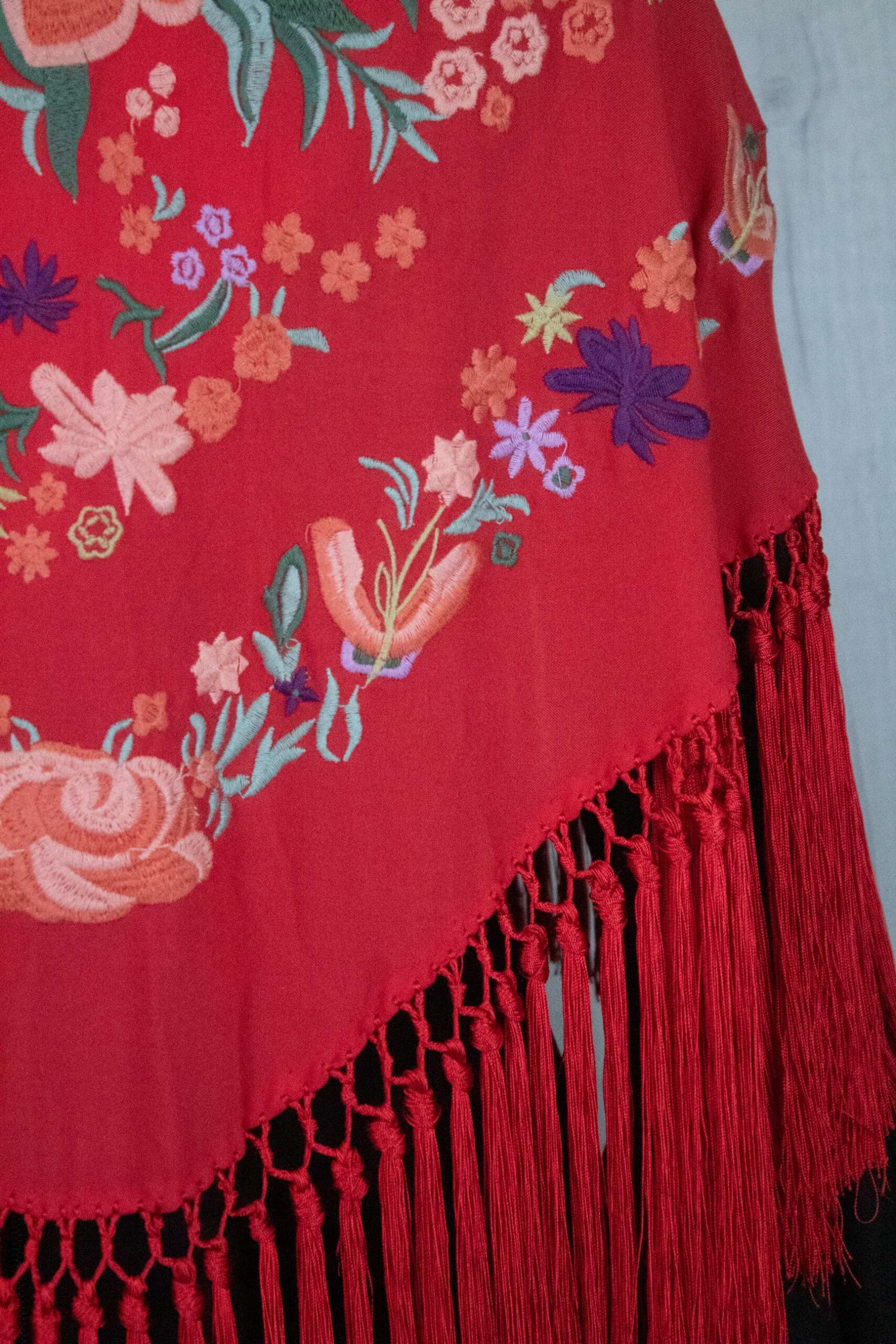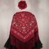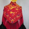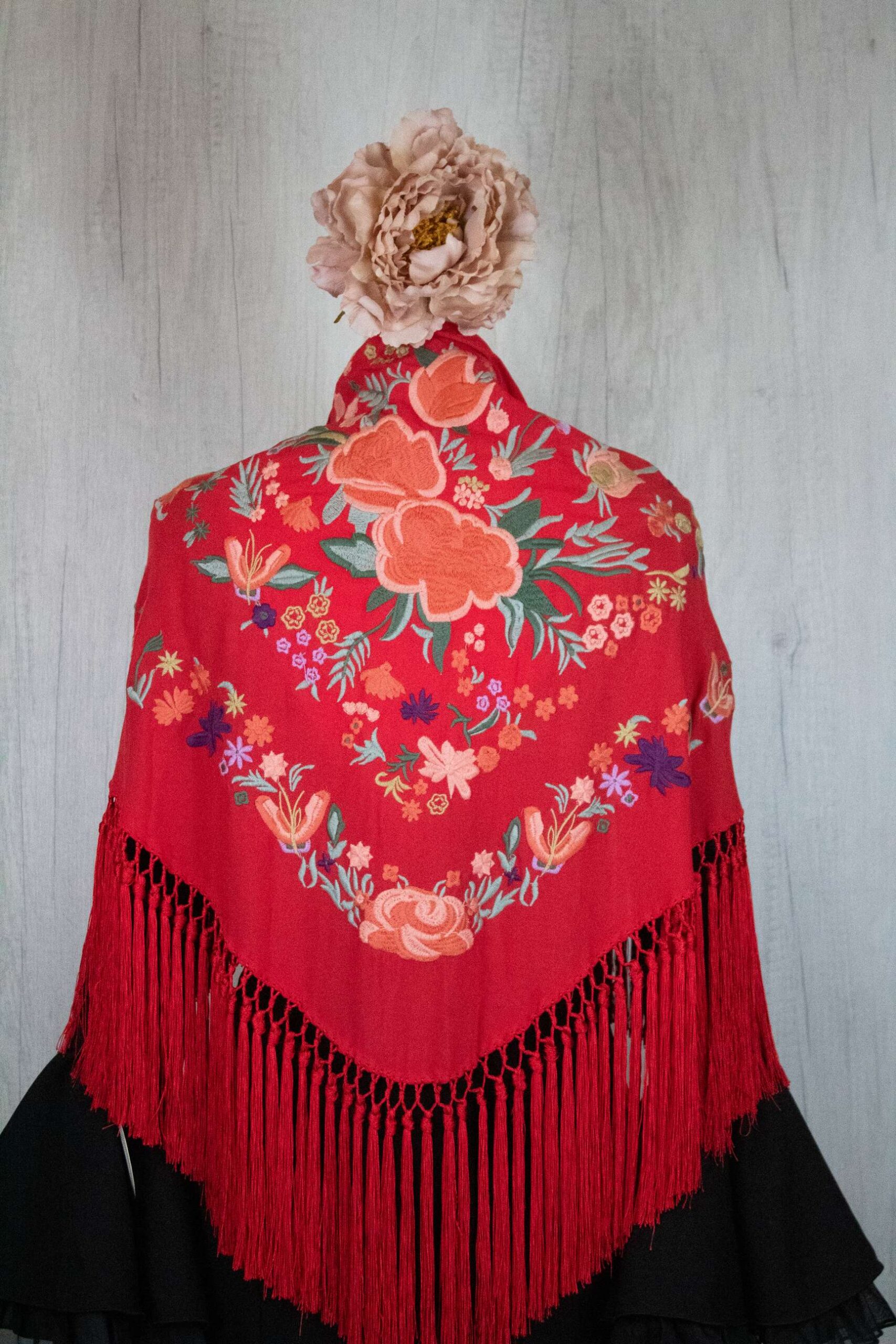 Mantón Alegría en color rojo, de algodón con bordado multicolor en hilo mate de seda.