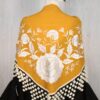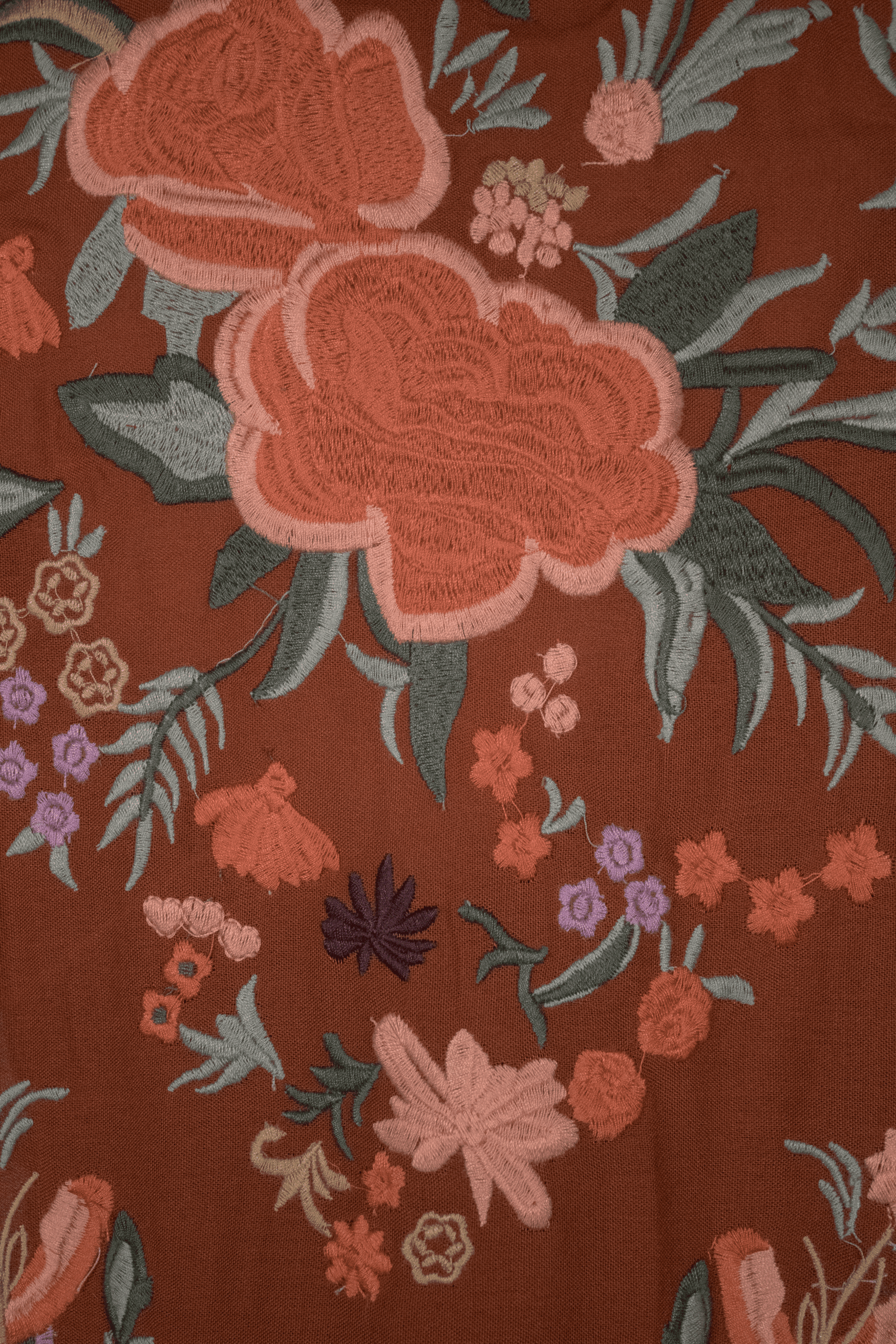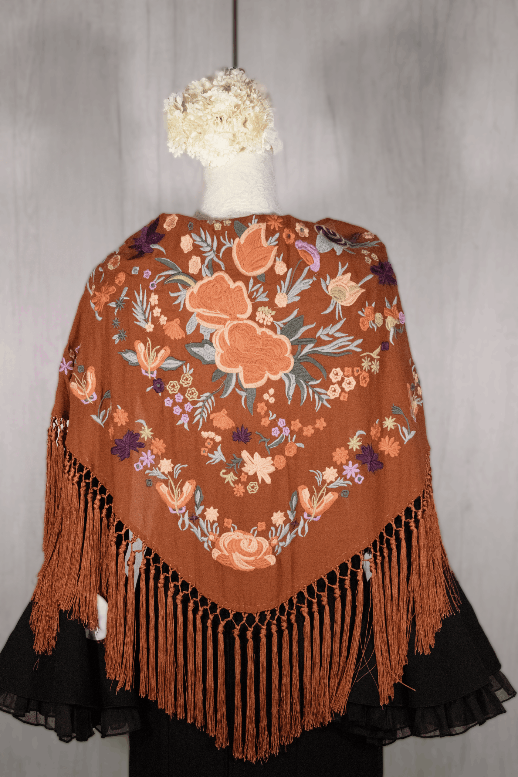 Mantón Alegría en color teja, de algodón con bordado multicolor en hilo mate de seda.