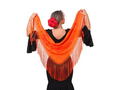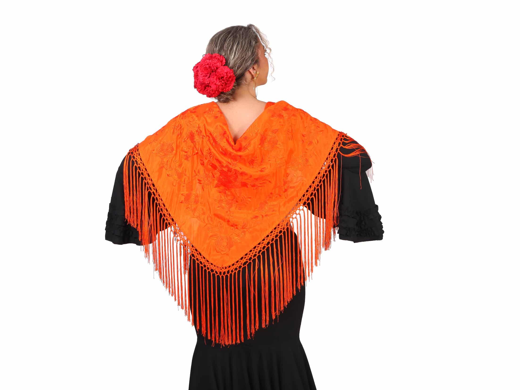 Mantón naranja bordado en monocolor,enrejado y flecado a mano con seda natural. Medidas 150x66cm aprox. (Sólo el mantón) más los flecos 30 cm (incluyendo el enrejado). Fabricado artesanalmente en la provincia de Sevilla.