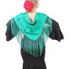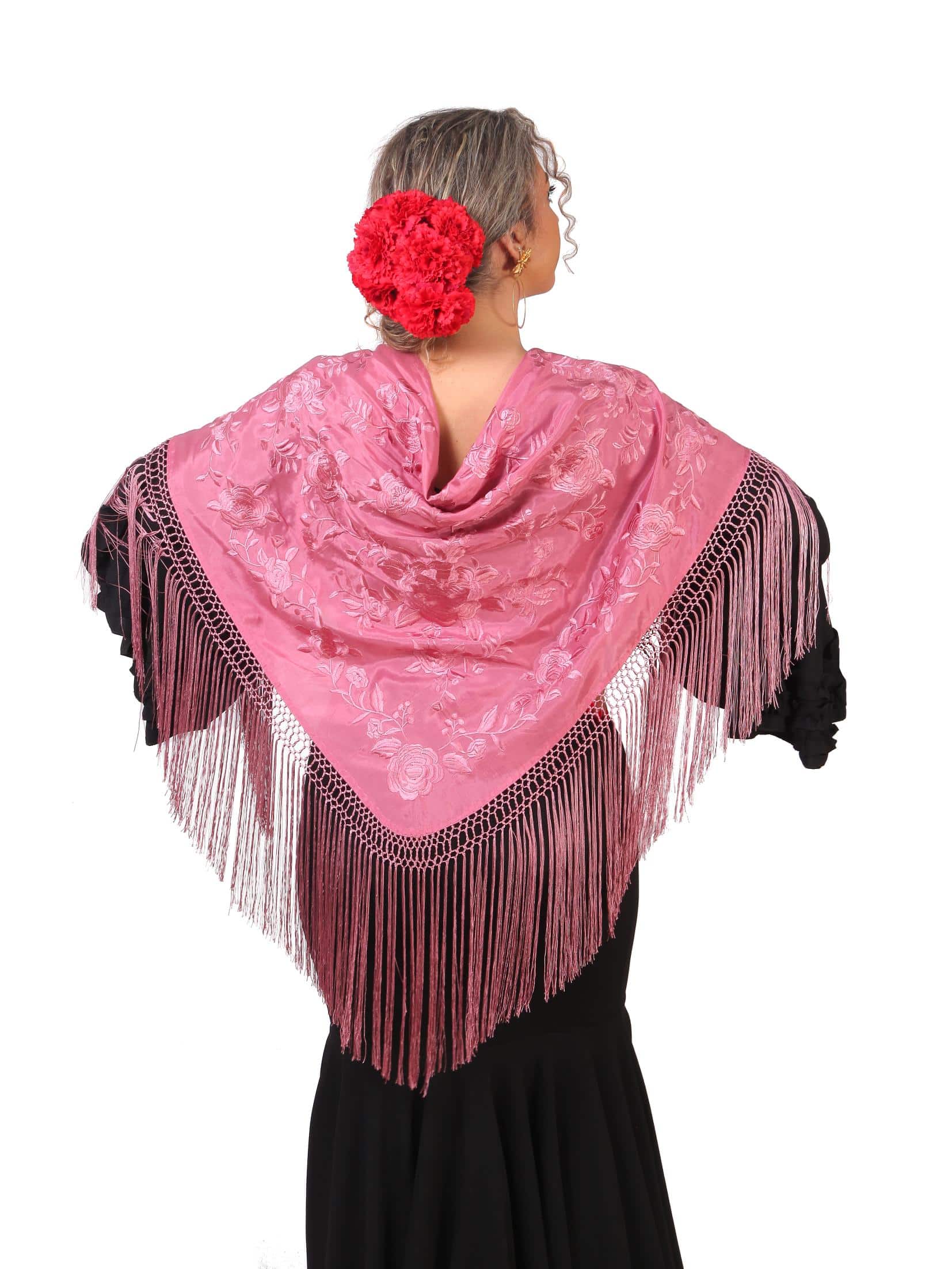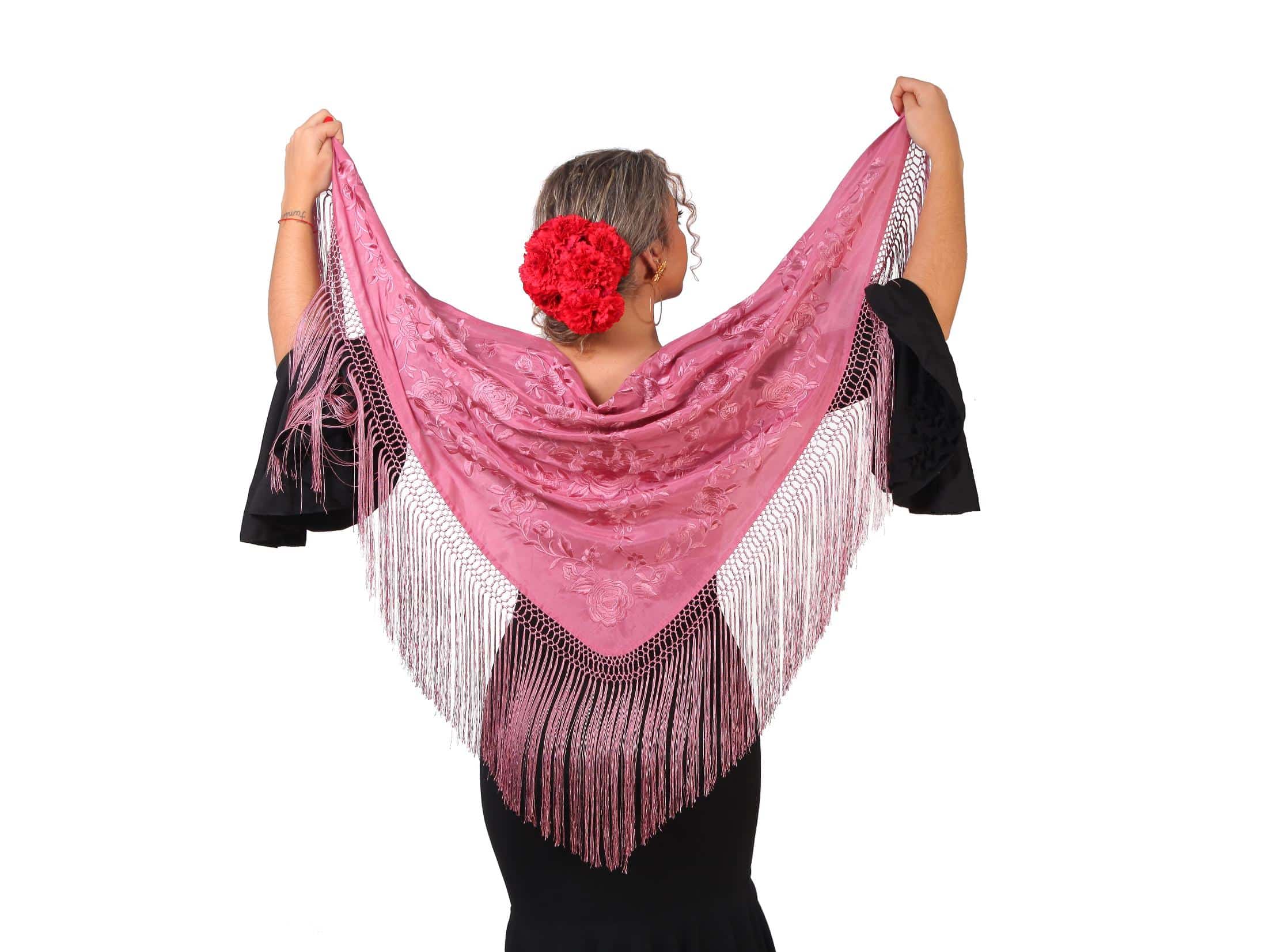 Mantón rosa empolvado bordado en monocolor,enrejado y flecado a mano con seda natural. Medidas 150x66cm aprox. (Sólo el mantón) más los flecos 30 cm (incluyendo el enrejado). Fabricado artesanalmente en la provincia de Sevilla.