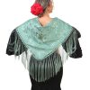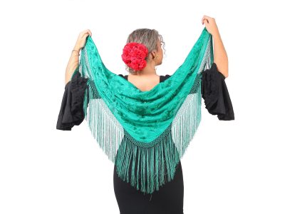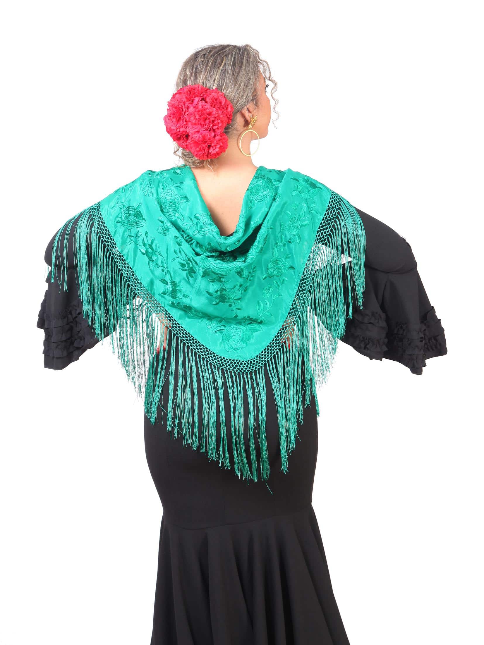 Mantón verde esmeralda bordado en monocolor,enrejado y flecado a mano con seda natural. Medidas 150x66cm aprox. (Sólo el mantón) más los flecos 30 cm (incluyendo el enrejado). Fabricado artesanalmente en la provincia de Sevilla.