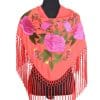 Mantón amarillo bordado en multicolor, enrejado y flecado a mano con seda natural. Medidas 135x60cm aprox. (Sólo el mantón) más los flecos 25 cm (incluyendo el enrejado). Fabricado artesanalmente en la provincia de Sevilla.