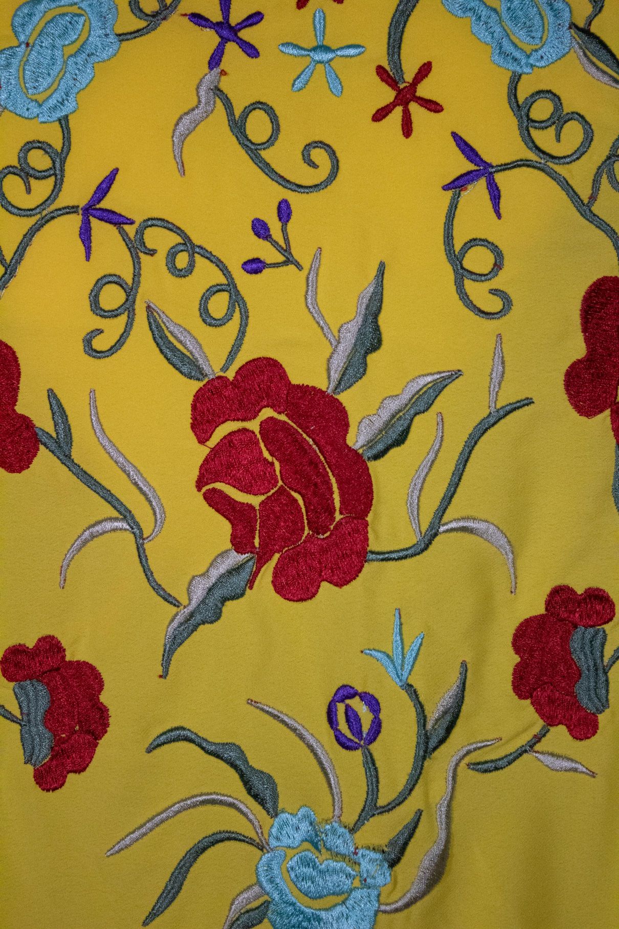Mantón amarillo bordado en multicolor, enrejado y flecado a mano con seda natural. Medidas 135x60cm aprox. (Sólo el mantón) más los flecos 25 cm (incluyendo el enrejado). Fabricado artesanalmente en la provincia de Sevilla.