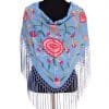 Mantón azul azafata bordado en multicolor, enrejado y flecado a mano con seda natural. Medidas 135x60cm aprox. (Sólo el mantón) más los flecos 25 cm (incluyendo el enrejado). Fabricado artesanalmente en la provincia de Sevilla.