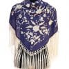 Mantón azulino bordado en multicolor, enrejado y flecado a mano con seda natural. Medidas 135x60cm aprox. (Sólo el mantón) más los flecos 25 cm (incluyendo el enrejado). Fabricado artesanalmente en la provincia de Sevilla.