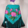 Mantón blanco bordado en multicolor, enrejado y flecado a mano con seda natural. Medidas 135x60cm aprox. (Sólo el mantón) más los flecos 25 cm (incluyendo el enrejado). Fabricado artesanalmente en la provincia de Sevilla.