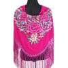 Mantón buganvilla bordado en multicolor, enrejado y flecado a mano con seda natural. Medidas 135x60cm aprox. (Sólo el mantón) más los flecos 25 cm (incluyendo el enrejado). Fabricado artesanalmente en la provincia de Sevilla.