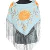 Mantón buganvilla bordado en multicolor, enrejado y flecado a mano con seda natural. Medidas 135x60cm aprox. (Sólo el mantón) más los flecos 25 cm (incluyendo el enrejado). Fabricado artesanalmente en la provincia de Sevilla.