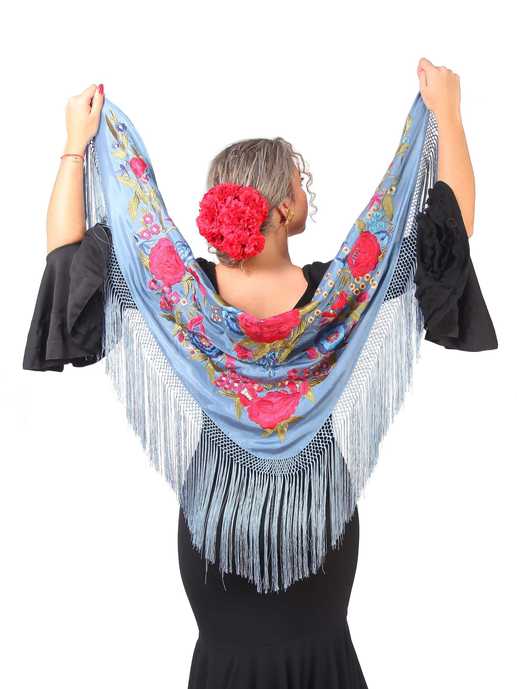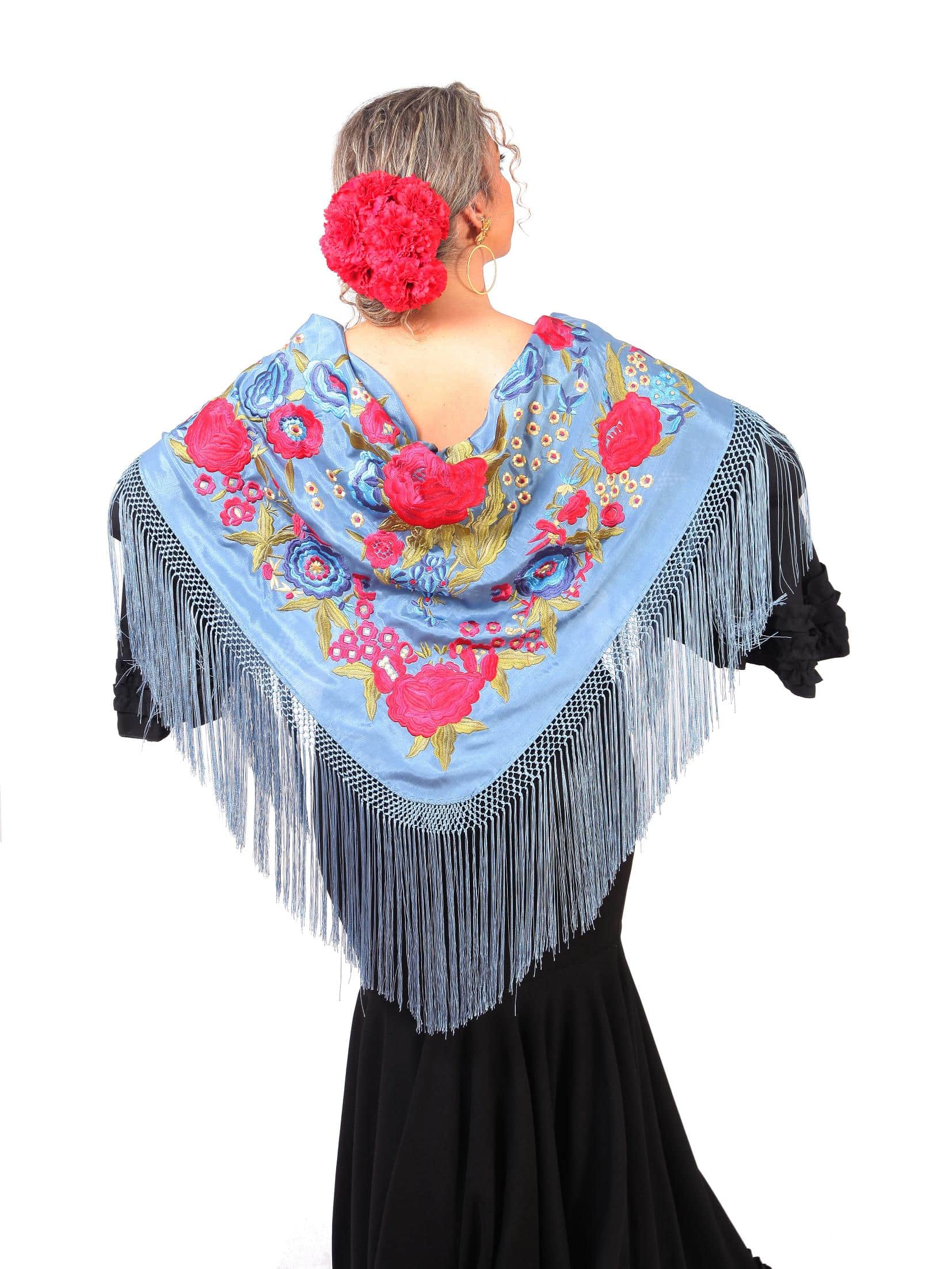 Mantón azul ducado bordado en multicolor donde predomina el rojo y azul .Enrejado y flecado a mano con seda natural. Medidas 150x66cm aprox. (Sólo el mantón) más los flecos 26 cm (incluyendo el enrejado). Fabricado artesanalmente en la provincia de Sevilla.