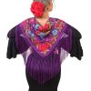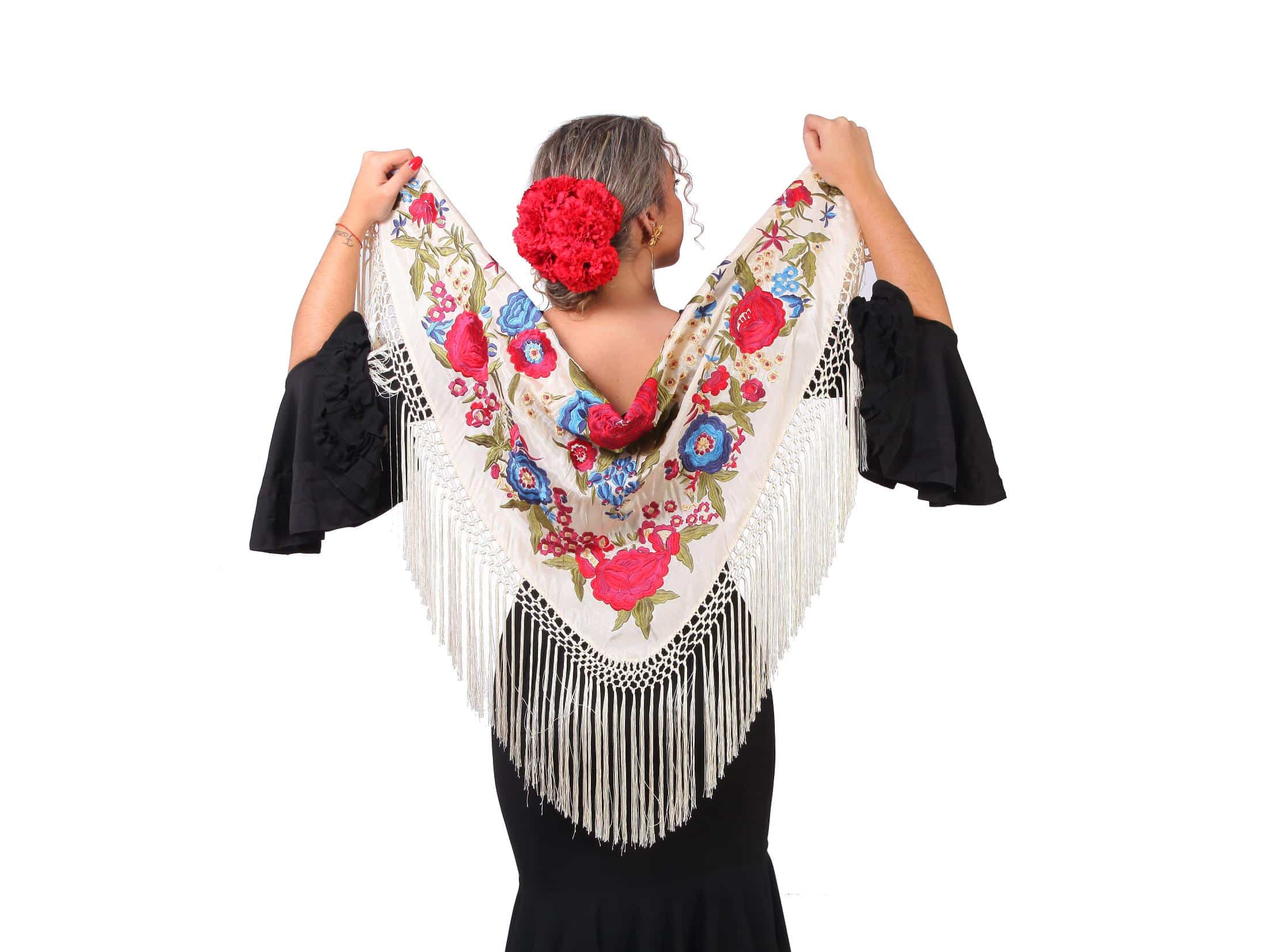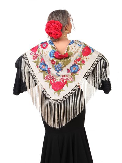 Mantón beige bordado en multicolor donde predomina el rojo y azul .Enrejado y flecado a mano con seda natural. Medidas 150x66cm aprox. (Sólo el mantón) más los flecos 26 cm (incluyendo el enrejado). Fabricado artesanalmente en la provincia de Sevilla.