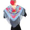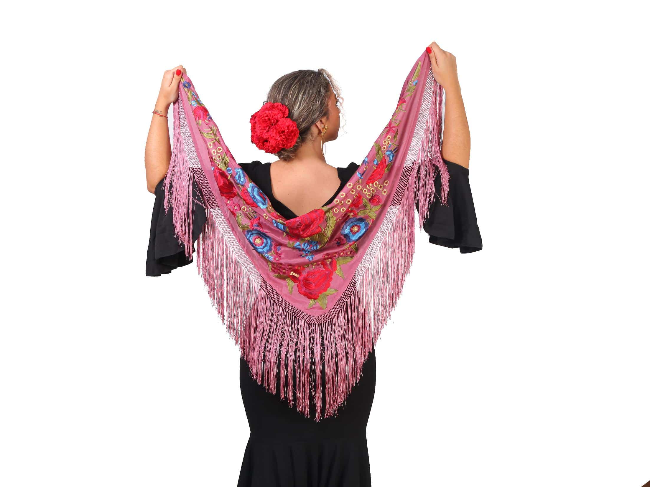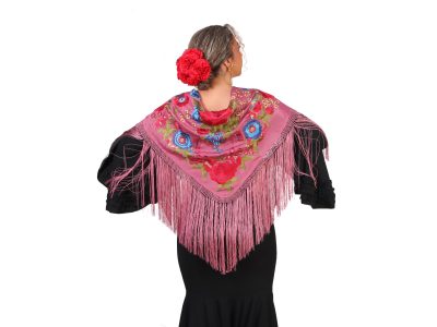 Mantón rosa empolvado bordado en multicolor donde predomina el rojo y azul .Enrejado y flecado a mano con seda natural. Medidas 150x66cm aprox. (Sólo el mantón) más los flecos 26 cm (incluyendo el enrejado). Fabricado artesanalmente en la provincia de Sevilla.