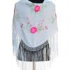 Mantón celeste bordado en multicolor, enrejado y flecado a mano con seda natural. Medidas 135x60cm aprox. (Sólo el mantón) más los flecos 25 cm (incluyendo el enrejado). Fabricado artesanalmente en la provincia de Sevilla.