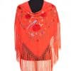 Mantón coral bordado en multicolor, enrejado y flecado a mano con seda natural. Medidas 135x60cm aprox. (Sólo el mantón) más los flecos 25 cm (incluyendo el enrejado). Fabricado artesanalmente en la provincia de Sevilla.