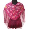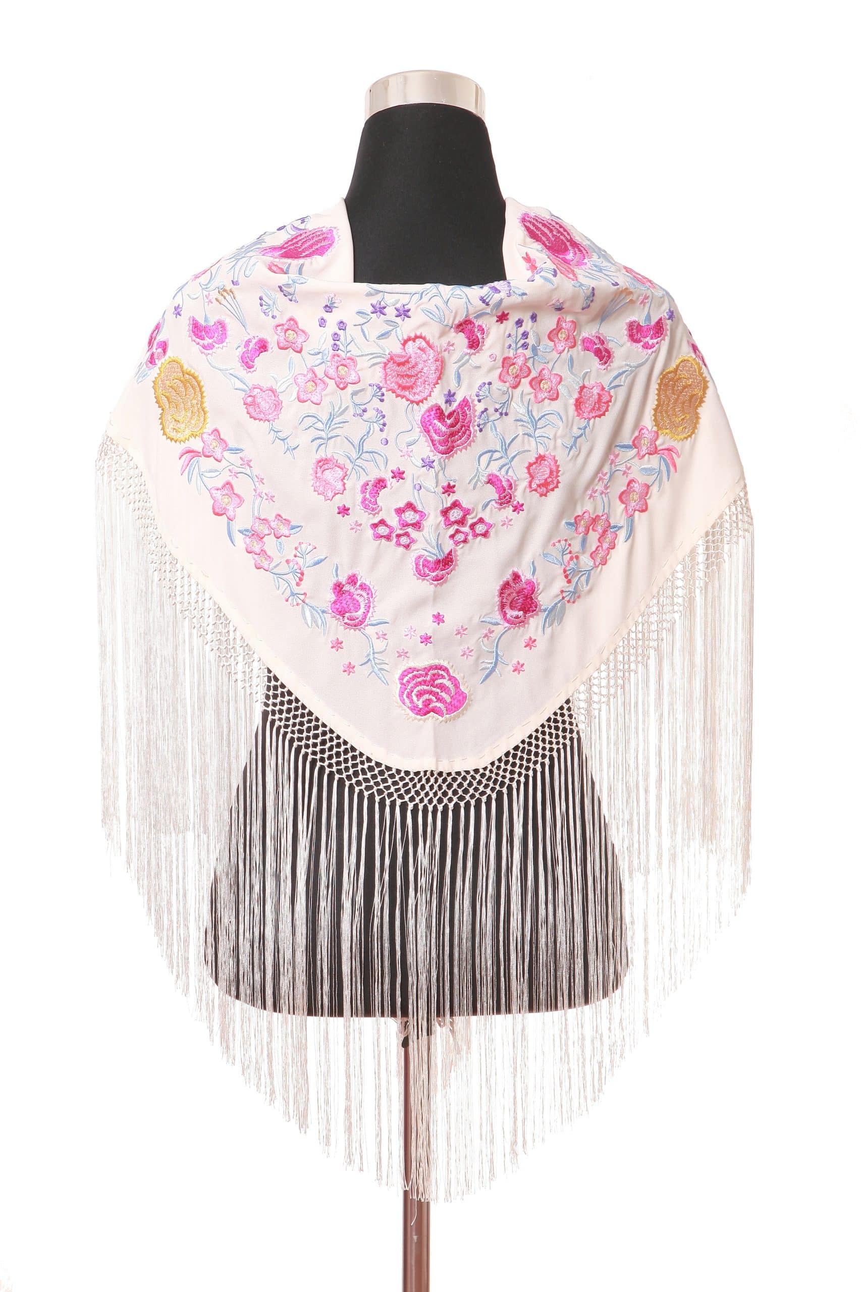 Mantón color beige bordado en tonalidades rosas de algodón flecado en mano con borlón en seda y enrejado en seda natural. Medidas 135x60cm aprox. (Sólo el mantón) más los flecos 25 cm (incluyendo el enrejado). Fabricado artesanalmente en la provincia de Sevilla.