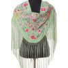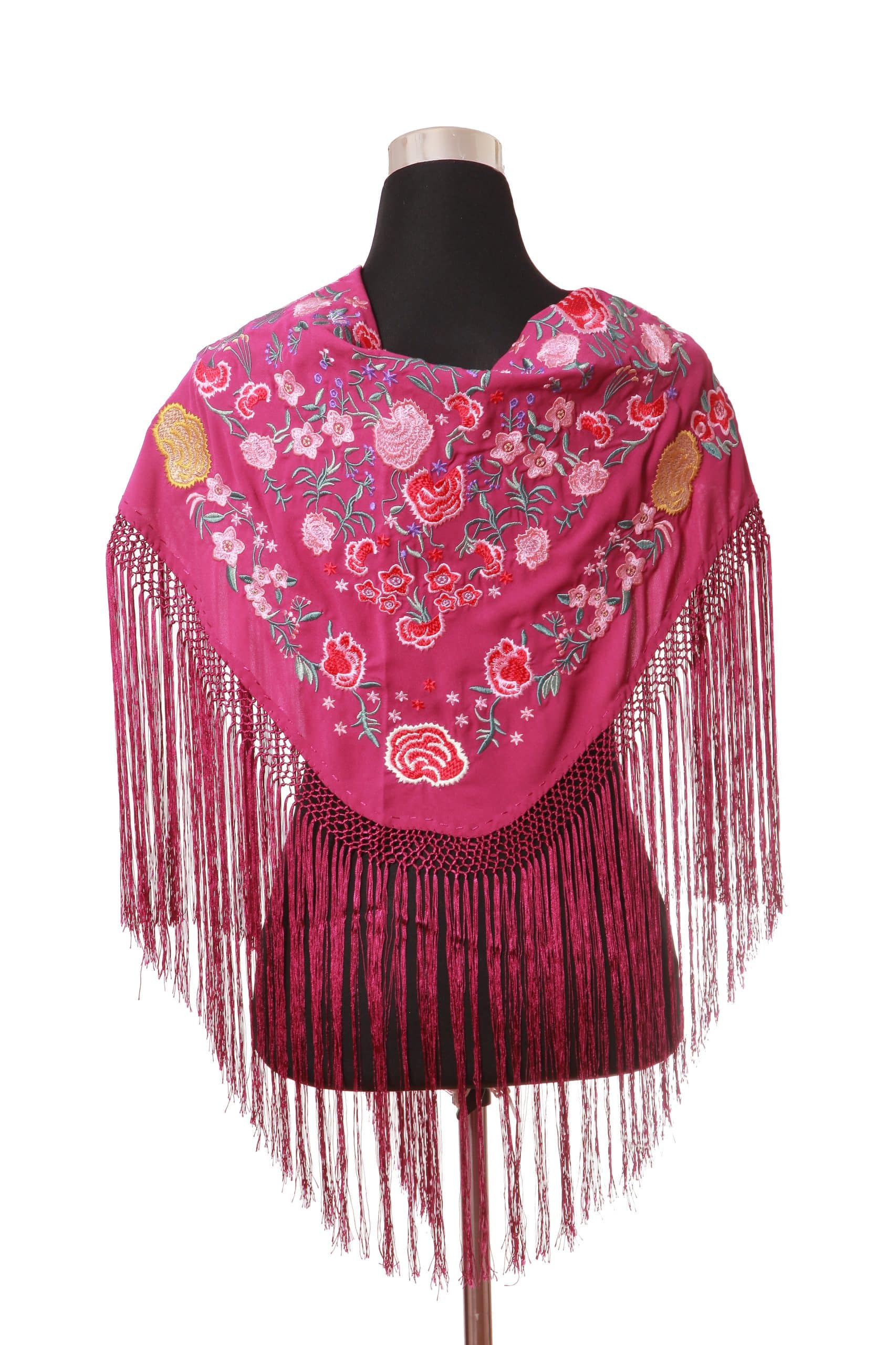 Mantón color buganvilla bordado en multicolor de algodón flecado en mano con borlón en seda y enrejado en seda natural. Medidas 135x60cm aprox. (Sólo el mantón) más los flecos 25 cm (incluyendo el enrejado). Fabricado artesanalmente en la provincia de Sevilla.