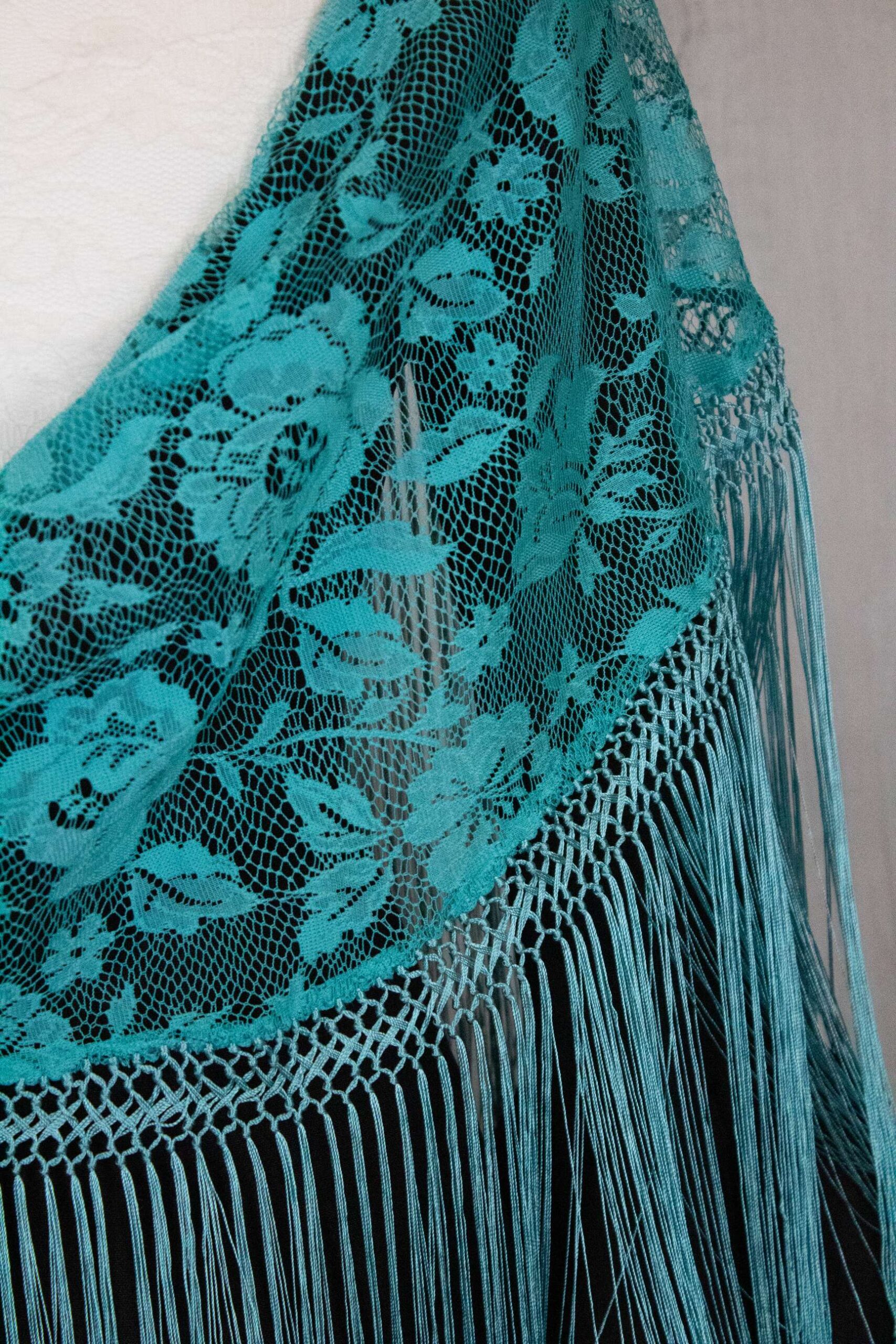 Precioso mantón de encaje, acabado en enrejado en su tono.