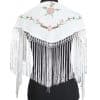 Mantón de niña blanco bordado en tonos multicolor, enrejado y flecado a mano con seda natural. Medidas 103x34cm aprox. (Sólo el mantón) más los flecos 20 cm (incluyendo el enrejado). Fabricado artesanalmente en la provincia de Sevilla.