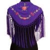 Mantón de niña buganvilla bordado en tonos verdes, enrejado y flecado a mano con seda natural. Medidas 103x34cm aprox. (Sólo el mantón) más los flecos 20 cm (incluyendo el enrejado). Fabricado artesanalmente en la provincia de Sevilla.
