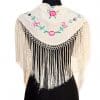 Mantón de niña marfil bordado en tonos multicolor, enrejado y flecado a mano con seda natural. Medidas 103x34cm aprox. (Sólo el mantón) más los flecos 20 cm (incluyendo el enrejado). Fabricado artesanalmente en la provincia de Sevilla.