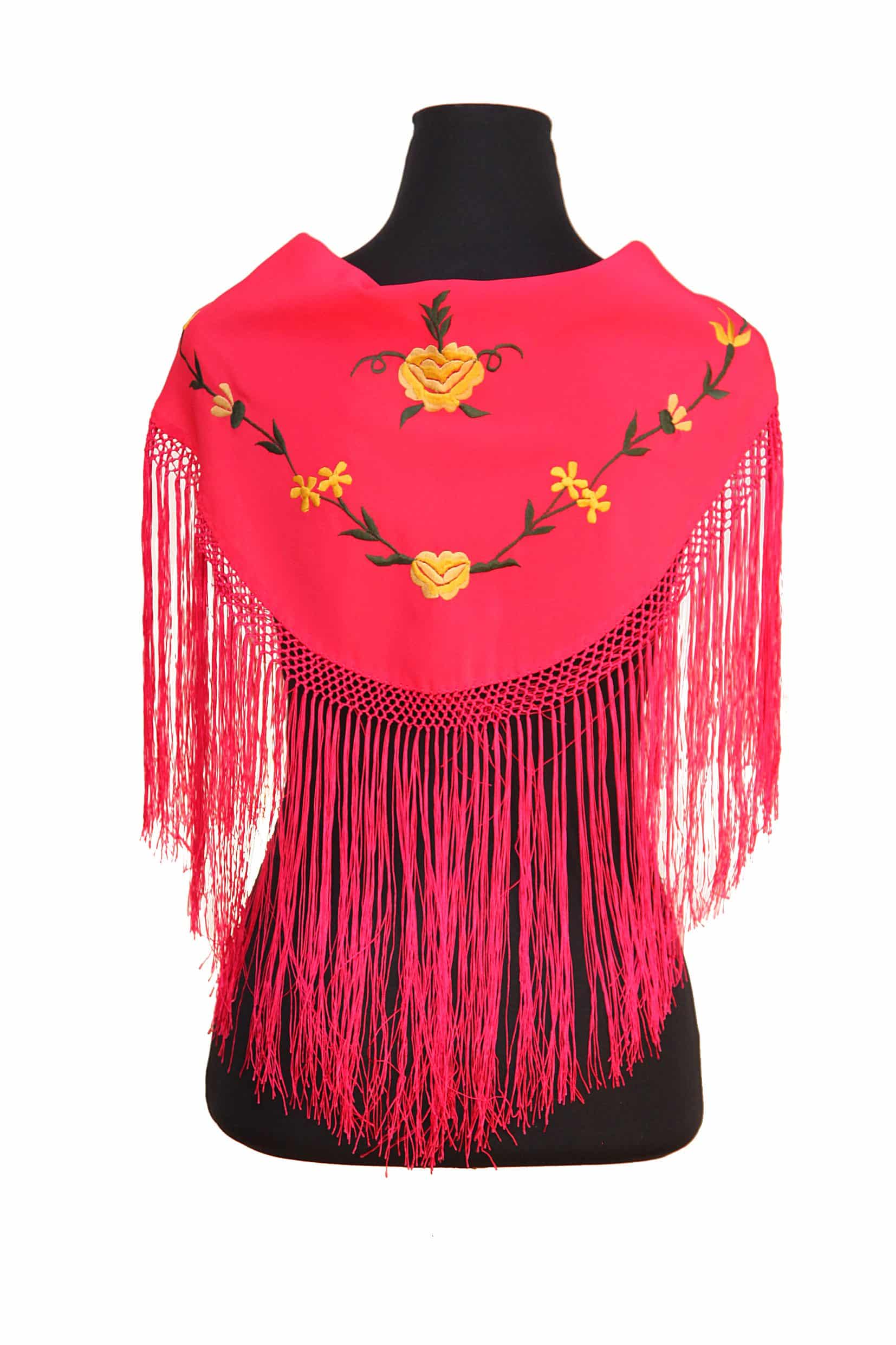 Mantón de niña rosa fucsia bordado en multicolor, enrejado y flecado a mano con seda natural. Medidas 103x34cm aprox. (Sólo el mantón) más los flecos 20 cm (incluyendo el enrejado). Fabricado artesanalmente en la provincia de Sevilla.