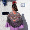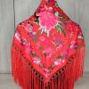 Mantón maquillaje bordado en multicolor .Enrejado y flecado a mano con seda natural. Medidas 150x66cm aprox. (Sólo el mantón) más los flecos 26 cm (incluyendo el enrejado). Fabricado artesanalmente en la provincia de Sevilla.