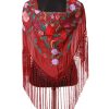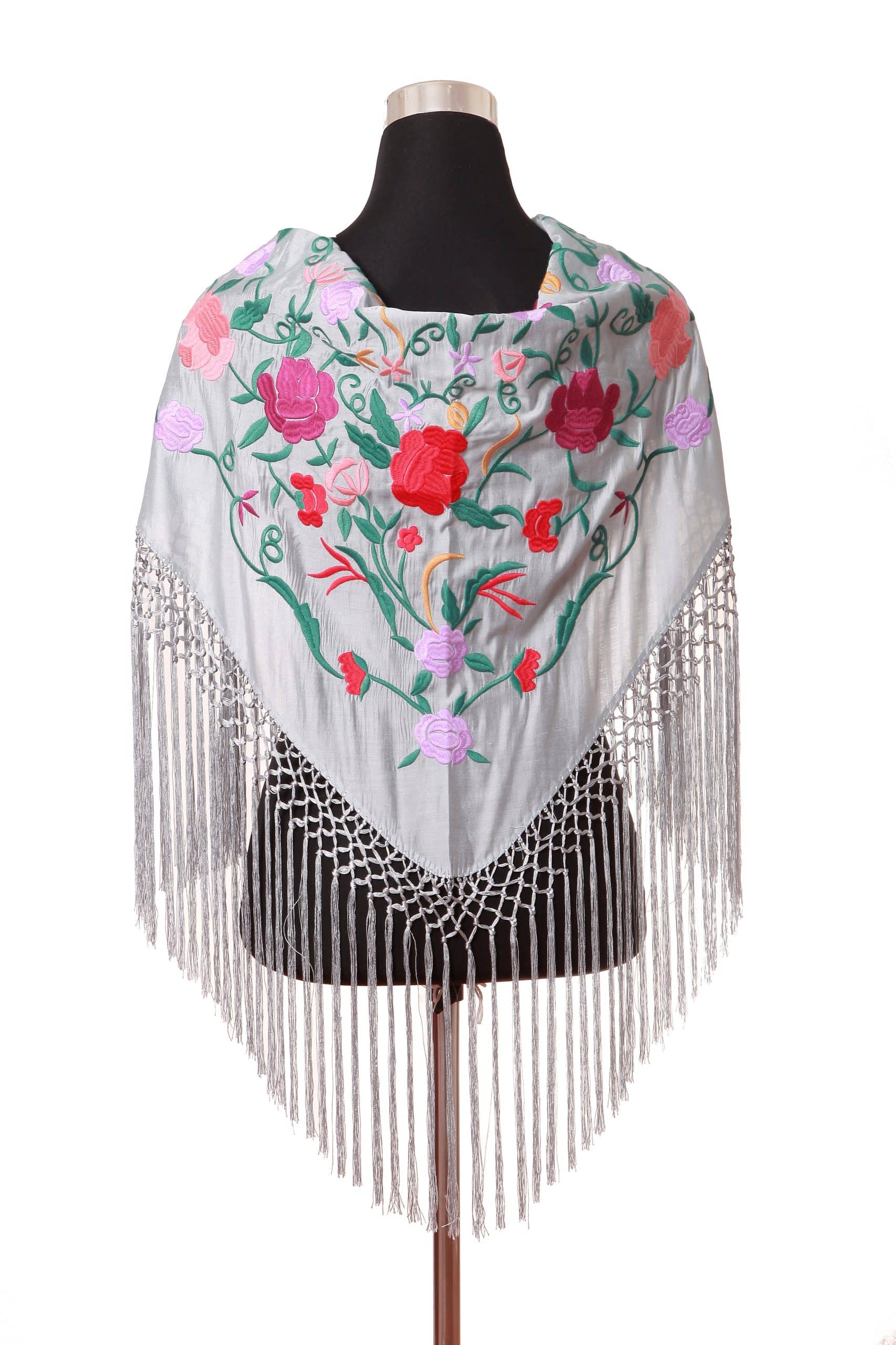 Mantón color gris bordado en multicolor de algodón flecado en mano con borlón en seda y enrejado en seda natural. Medidas 135x60cm aprox. (Sólo el mantón) más los flecos 25 cm (incluyendo el enrejado). Fabricado artesanalmente en la provincia de Sevilla.