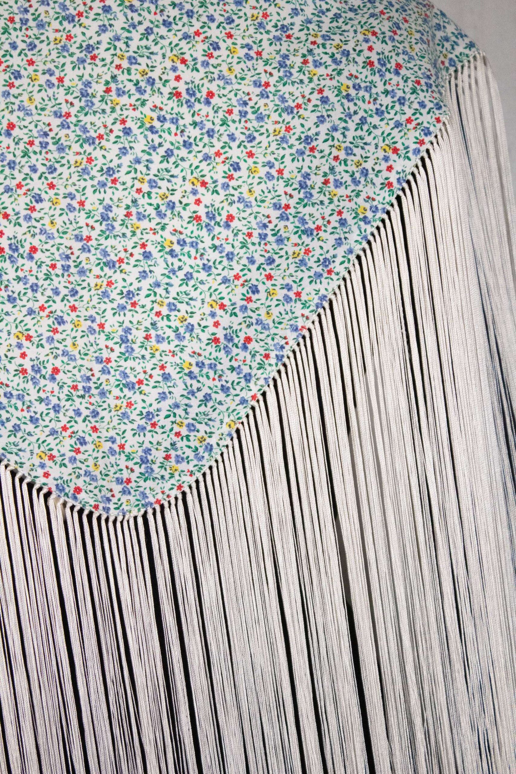 Mantón blanco con estampado de flores pequeñas, acabado en flecos blancos.